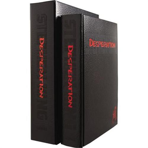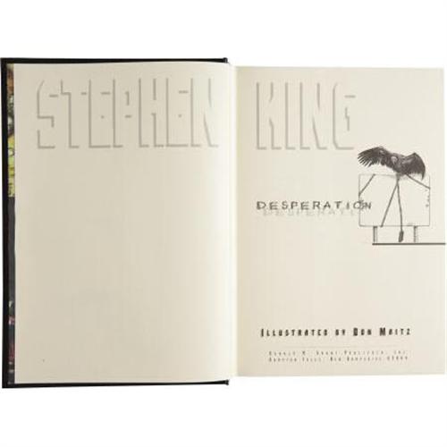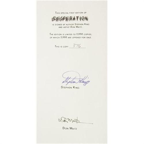 <B>Stephen King. </B></I><B><I>Desperation</B></I></B></I><B>.</B></I> Hampton Falls, New Hampshire: Donald M. Grant Publisher Inc., 1996. <BR>First signed limted and first illustrated edition, signed by Stephen King and artist Don Maitz. One of 2,050 copies published (only 2,000 were made available for purchase), this being number 376. Octavo. 524 pages.<BR><BR>Full black leather with red foil lettering and decoration; pictorial endpapers. Housed in a black leather clamshell box with matching red foil letting and cover art; lined with red felt. Accompanied by the publisher's errata slip for an error on page 96. In exceptional condition, as new and very fine.<BR><BR><BR><b>Shipping:</b> Books & Catalogs (<a target="_blank" href="http://www.heritageauctions.com/common/shipping.php">view shipping information</a>)