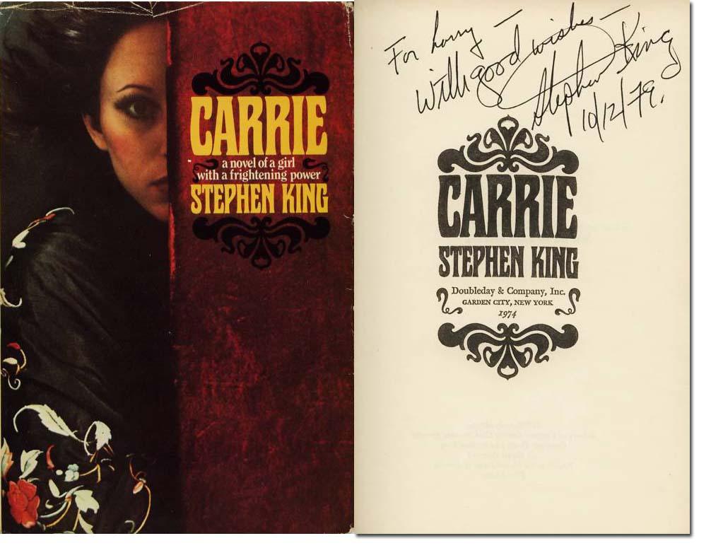 Stephen King 1974 Doubleday & Company first edition hardcover with dustjacket, ''Carrie.'' Inscribed by King at title page, ''For Larry - With Best Wishes - Stephen King, 10-12-1979.'' All first printing notes present, including a ''w/P6'' code at page 199. Original maroon full cloth boards with gilt lettering on spine. Some shelf wear, though pages are in fine condition. Dustjacket has moderate wear with original unclipped 5.95 price intact. Slight discoloration at front, else very good.