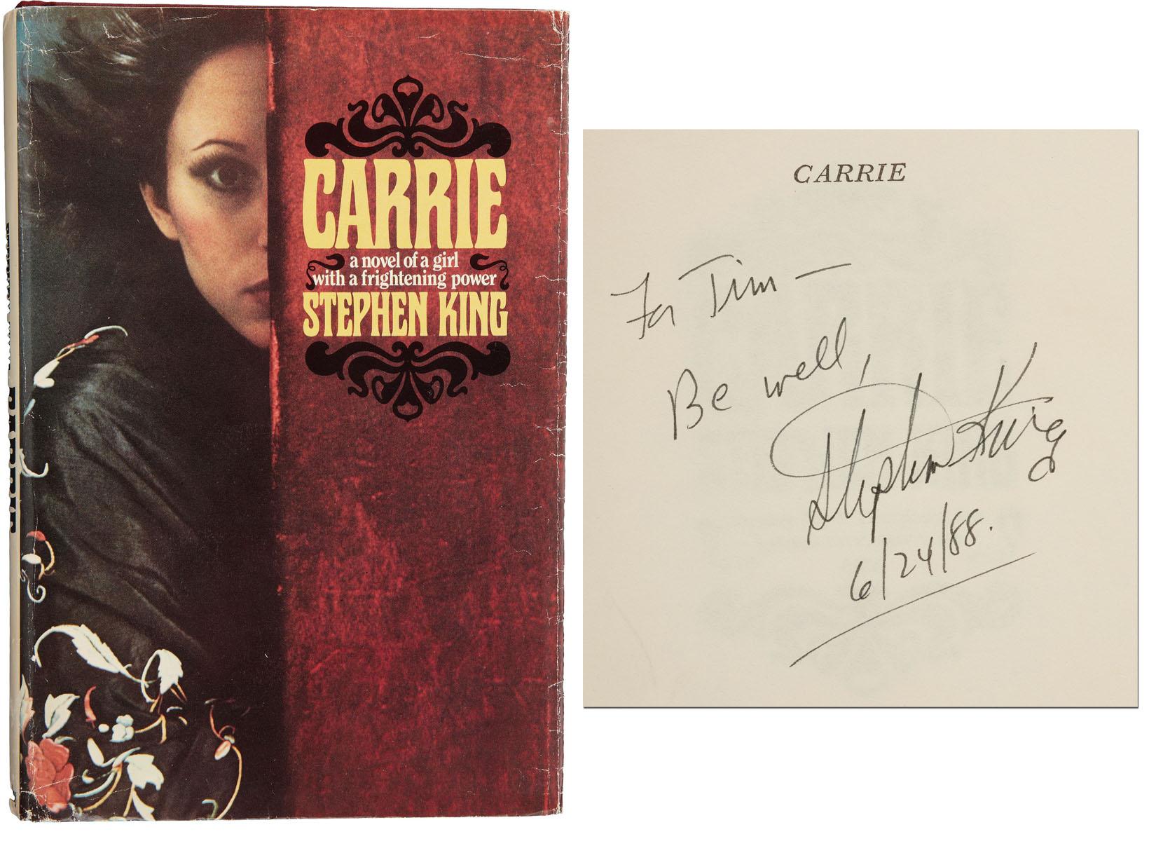 Signed and inscribed first edition copy of Stephen King's first published novel, ''Carrie.'' Garden City, New York: Doubleday & Company, Inc.: 1974. First edition, first impression (with code ''P6'' printed in the gutter of page 199). Inscribed by Stephen King in black ink on the half-title page, ''For Tim - Be well, Stephen King / 6/24/88.'' In publisher's original maroon cloth with gilt spine titles and deckled fore-edge. With very minor shelf wear and new endpapers. Dustjacket is slightly rubbed with a tiny tear to the foot of the spine. A near fine copy of the author's breakout novel.