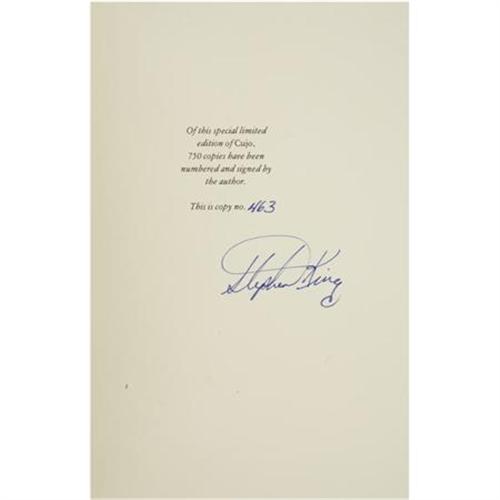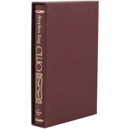 <B>Stephen King. </B></I><B><I>Cujo</B></I></B></I><B>.</B></I> New York: The Mysterious Press, 1981.<BR><BR>Limited edition of 750 numbered copies signed by the author on a special limitation page bound in back. Octavo. 319 pages.<BR><BR>Maroon cloth with titles in gilt on the spine and extensive decoration in gilt on the front and rear boards. A beautiful copy, almost as new in the matching slipcase as issued. A fine copy. <I>From the Robert and Diane Yaspan Collection.</B></I><BR><BR><b>Shipping:</b> Books & Catalogs (<a target="_blank" href="http://www.heritageauctions.com/common/shipping.php">view shipping information</a>)