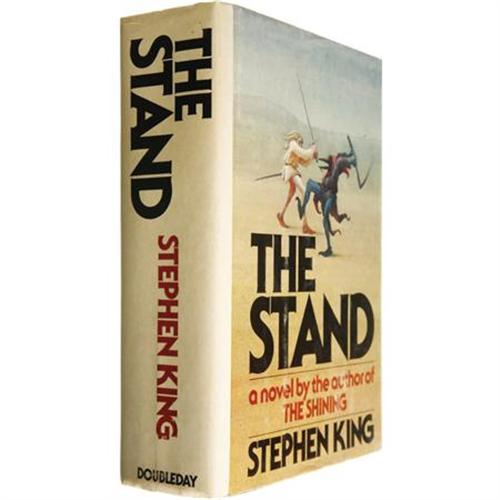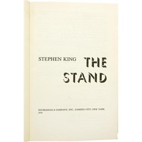 <B>Stephen King: First Edition of <I>The Stand</B></I></B></I> (New York: Doubleday, 1978), first edition (code "T39" present in the gutter of page 823), 823 pages, black half cloth and tan boards with gilt lettering on the spine, 8vo (5.75" x 8.5"), dust jacket. Deckled fore-edge. <I>The Stand</B></I> was King's fourth novel and fifth book to earn publication. It is an epic post-apocalyptic road movie of a story, set in a world decimated by the superflu, Captain Trips. The few remaining human beings must band together to stop the devilish villain Randall Flagg, a recurring character in many King stories. An uncut edition of The Stand was published in 1990, but this remains the very first publication of one of King's personal favorites among his works. The book has mild age-toning to the text edges, else fine. Very small closed tear to upper right front of the dust jacket, and mild rubbing to the boards, else fine.<BR><BR><b>Shipping:</b> Books & Catalogs (<a target="_blank" href="http://www.heritageauctions.com/common/shipping.php">view shipping information</a>)