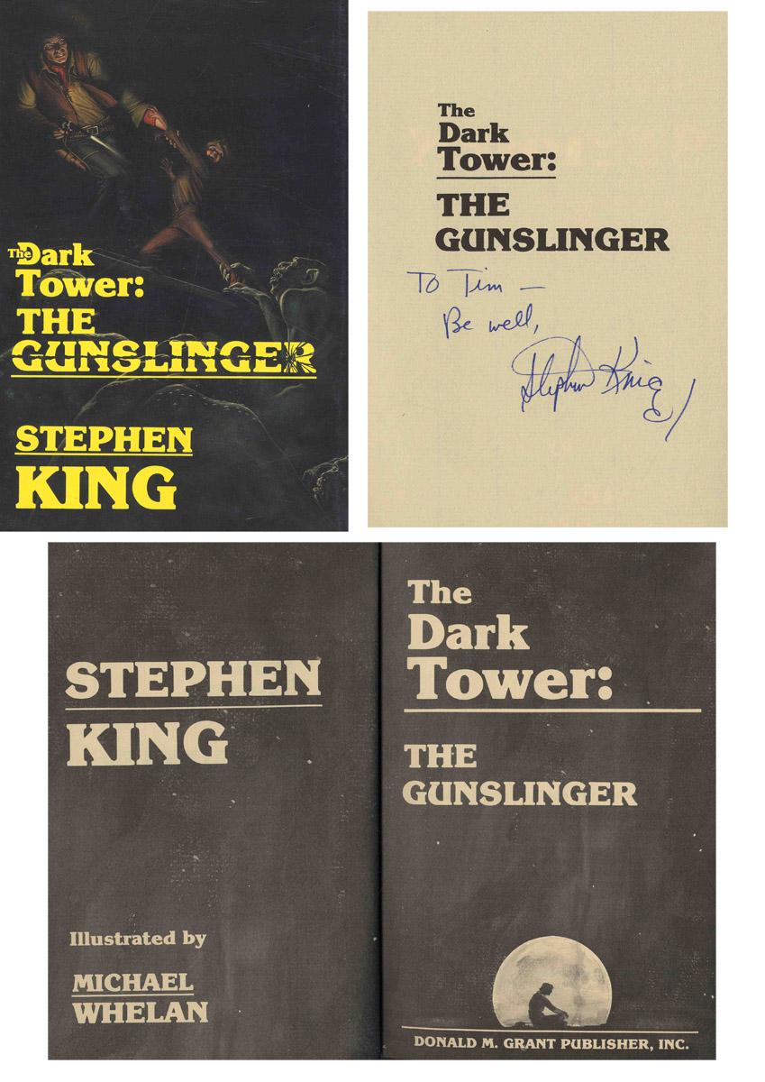 Stephen King signed and inscribed first edition, first printing of ''The Gunslinger''. Inscribed in blue ink on the half-title page, ''To Tim - Be well, Stephen King''. Published by Donald M. Grant: Rhode Island: 1982. All first-edition points present including ''Printed in the United States of America - First Edition'' on copyright page. In unclipped dustjacket, and original maroon cloth boards with gilt lettering. A beautiful copy in near fine condition with slipcase.