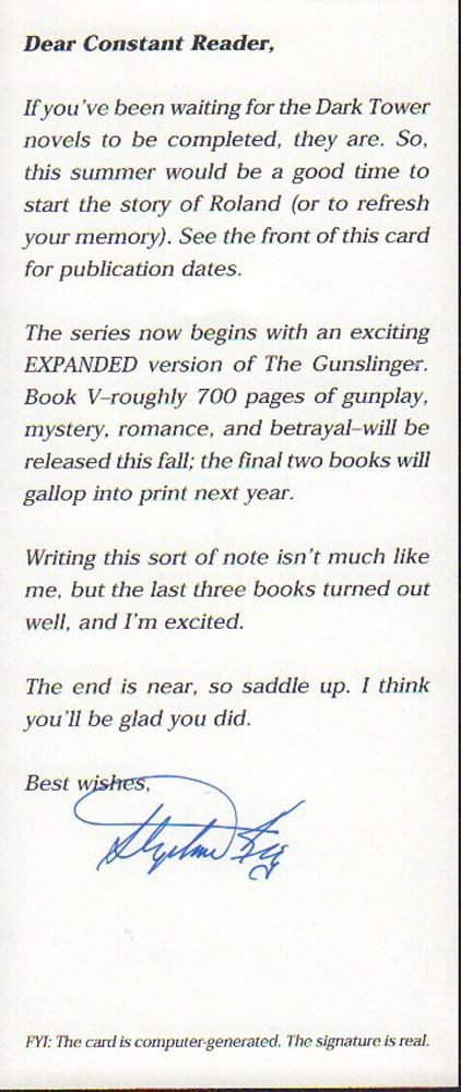 Form letter for the Dark Tower novels to be completed signed by author Stephen King. As he states on the bottom of the page, the card is computer-generated. The The signature is real. The reverse side features the covers of the books included in the Dark Tower series. All items come with a certificate of authenticity good for the life of the piece.