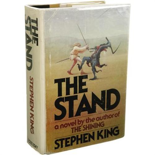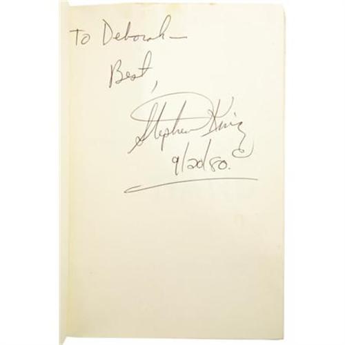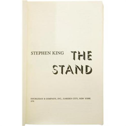 <B>Stephen King: Signed First Edition of <I>The Stand</B></I></B></I> (New York: Doubleday, 1978), first edition (code "T39" present in the gutter of page 823), 823 pages, black half cloth and tan boards with gilt titles, 8vo (5.75" x 8.5"), dust jacket. Deckled fore-edge. Inscribed and signed "<I>To Deborah - Best, Stephen King 9/20/80</B></I>" on the flyleaf between the half title and title pages. <I>The Stand</B></I> was King's fourth novel and fifth book to earn publication. It is a post-apocalyptic novel of epic sweep, and one of King's fan favorites. The book presented here is in about fine, with mild soiling to the textblock edges and some edge wear present. The dust jacket is in good condition, with some wrinkling present to the panels and spine, which also shows mild chipping at the ends.<BR><BR><b>Shipping:</b> Books & Catalogs (<a target="_blank" href="http://www.heritageauctions.com/common/shipping.php">view shipping information</a>)