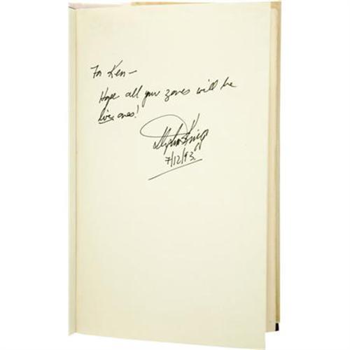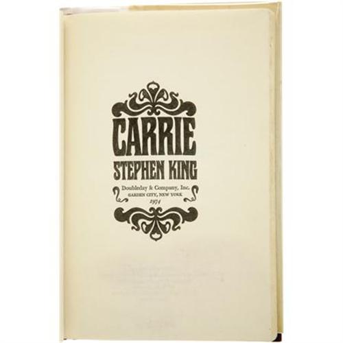 <B>Stephen King: Signed First Issue of <I>Carrie</B></I></B></I> (Garden City, New York: Doubleday & Company, Inc., 1974), first edition, 199 pages, maroon cloth with gilt spine lettering, 8vo (5.75" x 8.5"), dust jacket. Inscribed warmly and signed "<I>For Ken - Hope all your zones will be live ones! Stephen King 7/12/93.</B></I>" on the front flyleaf. This copy has the "P6" in the gutter of page 199, an essential point for the first issue of <I>Carrie.</B></I> The book is about fine in a very good unclipped dust jacket. Signed first editions of King's famous first novel are rare, especially in this condition.<BR><BR><b>Shipping:</b> Books & Catalogs (<a target="_blank" href="http://www.heritageauctions.com/common/shipping.php">view shipping information</a>)