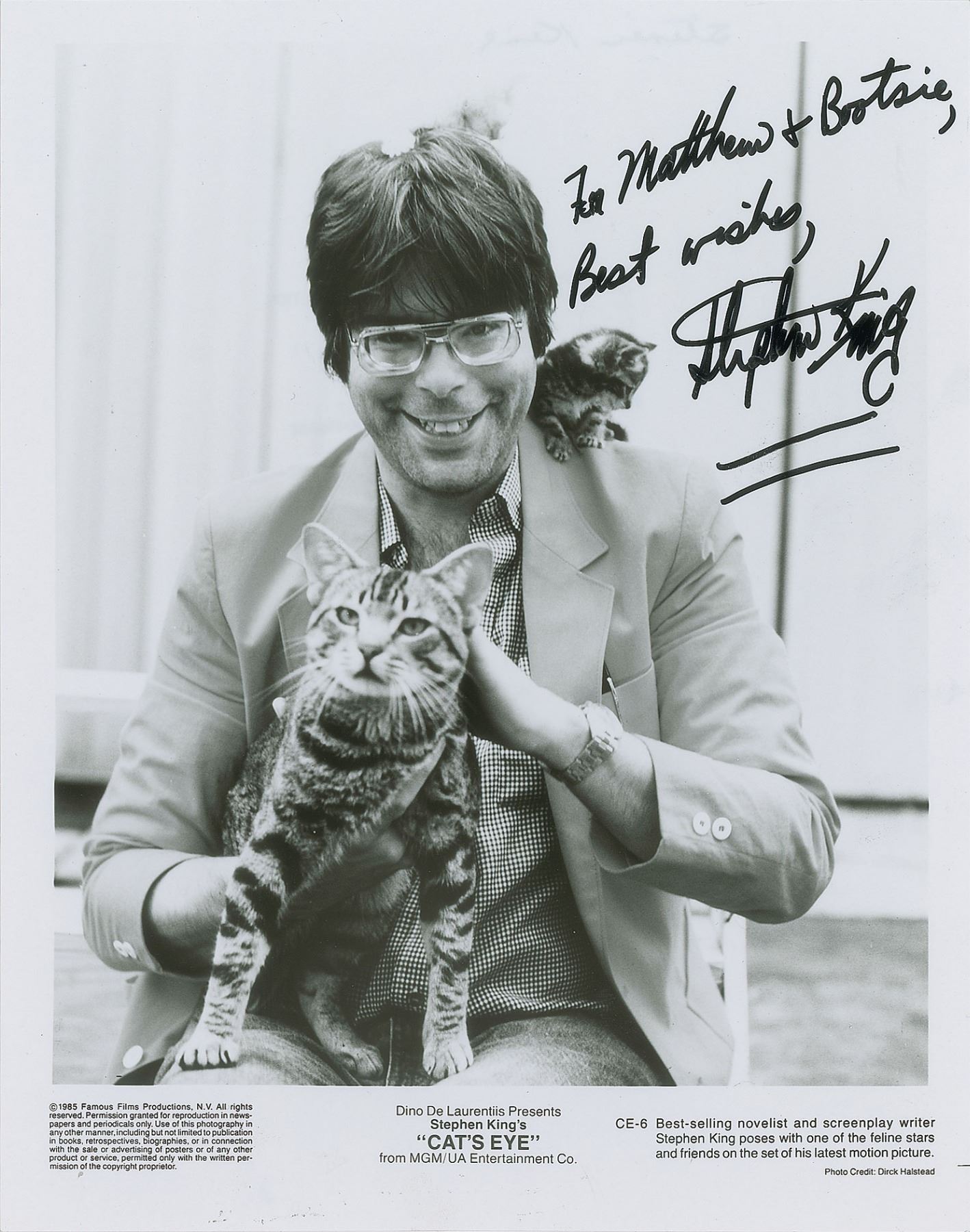 Glossy 8 x 10 Famous Films Productions publicity photo of King holding a cat, with a kitten on his shoulder, for the 1985 anthology horror film Cat's Eye, signed and inscribed in black felt tip, "For Matthew & Bootsie, Best wishes, Stephen King.” In fine condition.