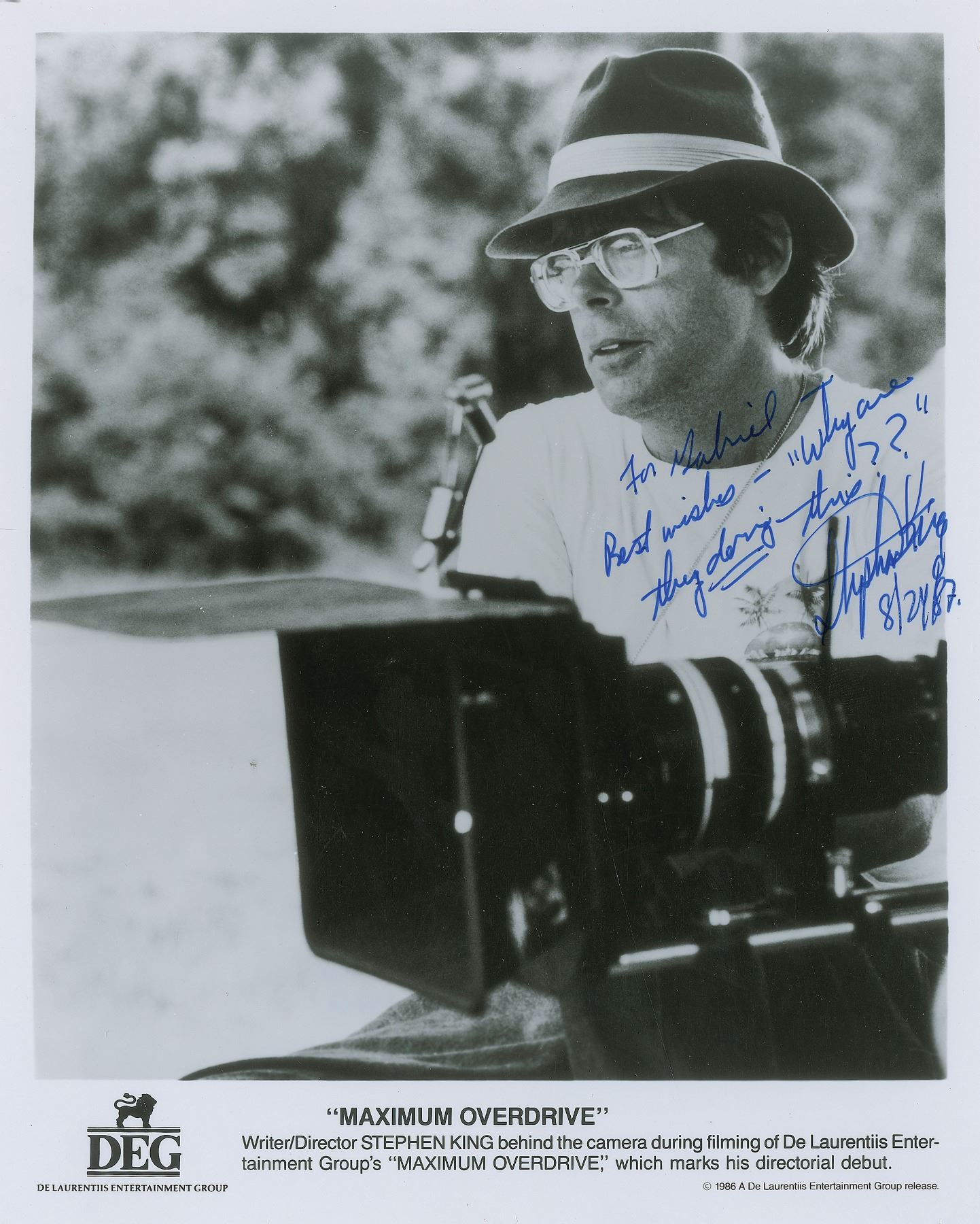 Glossy 8 x 10 De Laurentiis publicity photo of King behind the director's chair for the 1986 horror comedy Maximum Overdrive, signed and inscribed in blue ink, "For Gabriel—Best wishes—'Why are they doing this??' Stephen King, 8/24/87.” In fine condition.