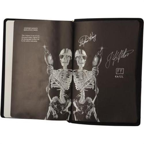 <B>Stephen King. </B></I><B><I>Skeleton Crew</B></I></B></I><B>.</B></I> Santa Cruz: Scream/Press, 1985.<BR><BR>First edition. One of perhaps 16 zippered copies lettered, numbered, and signed in silver ink by the author and illustrator on a special limitation page bound in back. Quarto. 545 pages. Illustrated by J. K. Potter. Fold out color poster laid-in.<BR><BR>Integrally bound in a black leather zippered case with silver titles on the spine and an illustration of a hard-hat wearing skull in blind on the front cover. Moire silk endpapers. All edges silver. One small bump to the foot of the spine. Two small indentions on the silver of the fore-edge. Unique and possibly the scarcest King lettered editions. Fine condition. <BR><BR>"Dealers are convinced a second state exists, since after a very long lull the publisher was suddenly able to just barely fill all the shorted orders. The publisher denies this, and, so far, no one we have talked to who is convinced such a state exists has been able to tell the difference. If it exists, it is nearly identical and a very, very small run. One evidence of this is that, in 1986, Connor contacted some major OP book dealers offering a "special edition" of Skeleton Crew in a leather zippered case. We believe 16 were so done and eventually sold at $150 each, although they appear to be from leftover sheets of the second run and neither of the two reported to us was signed by King or Potter." (Chalker 553) <I>From the Robert and Diane Yaspan Collection.</B></I><BR><BR><b>Shipping:</b> Books & Catalogs (<a target="_blank" href="http://www.heritageauctions.com/common/shipping.php">view shipping information</a>)