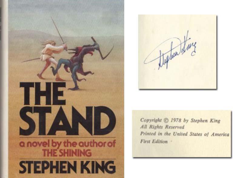 Stephen King signed hardcover first edition, first printing of ''The Stand''. Doubleday: New York: 1978. Nice ''Stephen King'' signature in blue ink on front free endpaper. The author's fourth published novel, widely hailed by critics and fans as one of his best, superbly weaves elements of horror and science fiction. All first edition/first printing points present including ''First Edition'' printed on copyright page. Unclipped dustjacket intact, thought it has been covered with a sticker. Both jacket and book in very good condition.