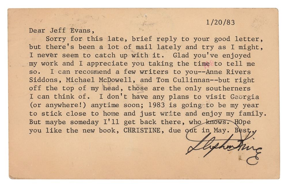 TLS, one page, typed on the reverse of a 5.5 x 3.5 postal card, January 20, 1983. Letter to Jeff Evans, in part: "Glad you’ve enjoyed my work and I appreciate you taking the time to tell me so. I can recommend a few writers to you--Anne Rivers Siddons, Michael McDowell, and Tom Cullinnan--but right off the top of my head, those are the only southerners I can think of. I don’t have any plans to visit Georgia (or anywhere!) anytime soon; 1983 is gong to be my year to stick close to home and just write and enjoy my family. But maybe someday I’ll get back there, who knows. Hope you like the new book, Christine, due out in May." In fine condition.