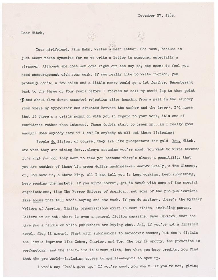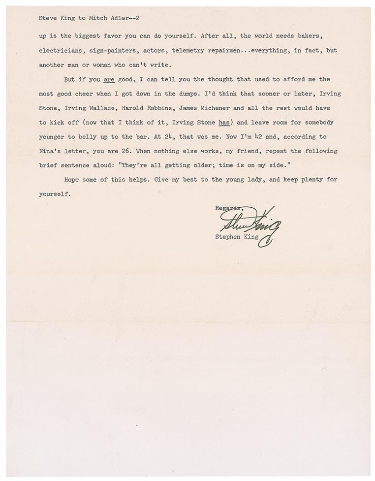 TLS signed “Steve King,” two pages, 8.5 x 11, December 27, 1989. Letter to an aspiring writer. In part: “Your girlfriend…writes a mean letter. She must, because it just about takes dynamite for me to write a letter to someone, especially a stranger. Although she does not come right out and say so, she seems to feel you need encouragement with your work. If you really like to write fiction, you probably don’t; a few sales and a little money would go a lot further. Remembering back to three of four years before I started to sell my stuff (up to that point I had about five dozen assorted rejection slips hanging from a nail in the laundry room where my typewriter was situated between the washer and the dryer), I’d guess that if there’s a crisis going on with you in regard to your work, it’s one of confidence rather than interest. Those doubts start to creep in…am I really good enough? Does anybody care if I am? Is anybody at all out there listening?…But if you are good, I can tell you the thought that used to afford me good cheer when I got down in the dumps. I’d think that sooner or later, Irving Stone, Irving Wallace, Harold Robbins, James Michener and all the rest would have to kick off (now that I think of it, Irving Stone has) and leave room for somebody younger to belly up to the bar. At 24, that was me…When nothing else works, my friend, repeat the following brief sentence aloud: ‘They’re all getting older; time is on my side.’” In fine condition. King is very scarce in letters, evidenced by his own humorous admission of needing “dynamite for me to write.”