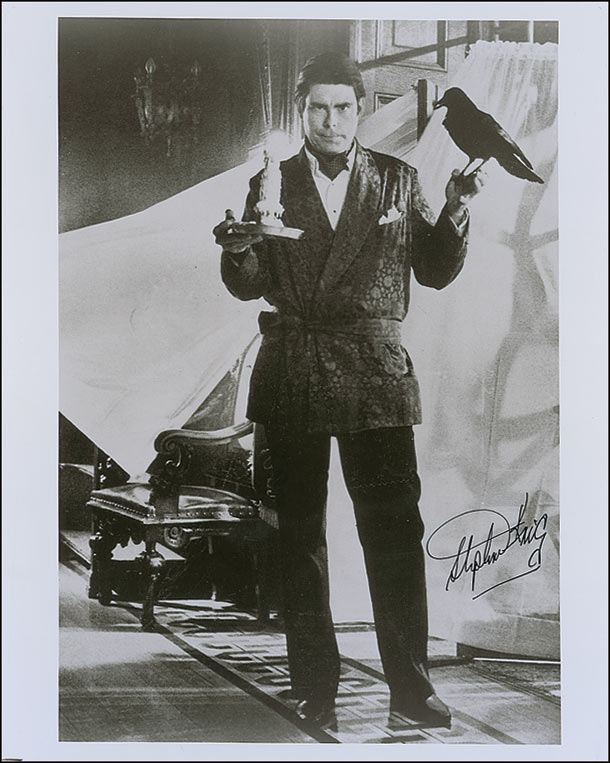 Uncommon creepy glossy 8 x 10 photo of King holding a candle, a raven perched on his other hand, signed in black felt tip. In fine condition.