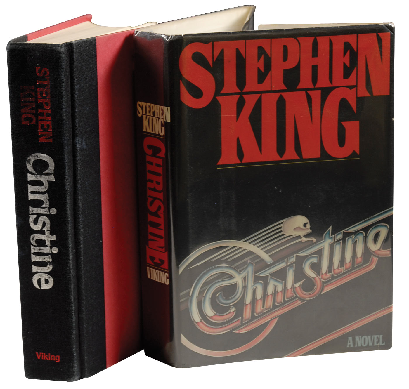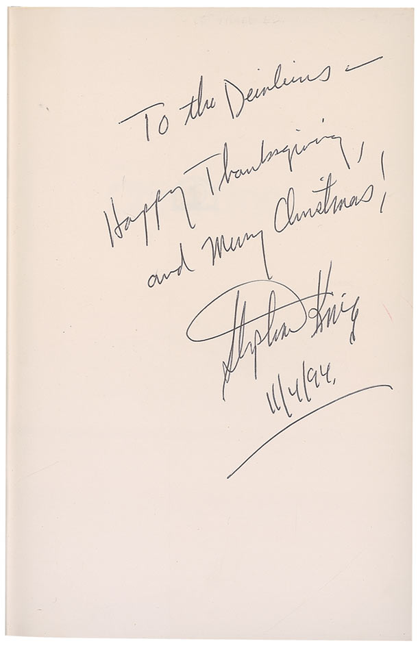 Signed book: Christine. Later printing. NY: Viking Press, 1983. Hardcover with dustjacket, 6.5 x 9.5, 526 pages. Signed and inscribed in black ballpoint on the first free end page “To the Deinleins—Happy Thanksgiving, and Merry Christmas! Stephen King 11/4/94.” In fine condition, with light soiling to the edges of the pages.