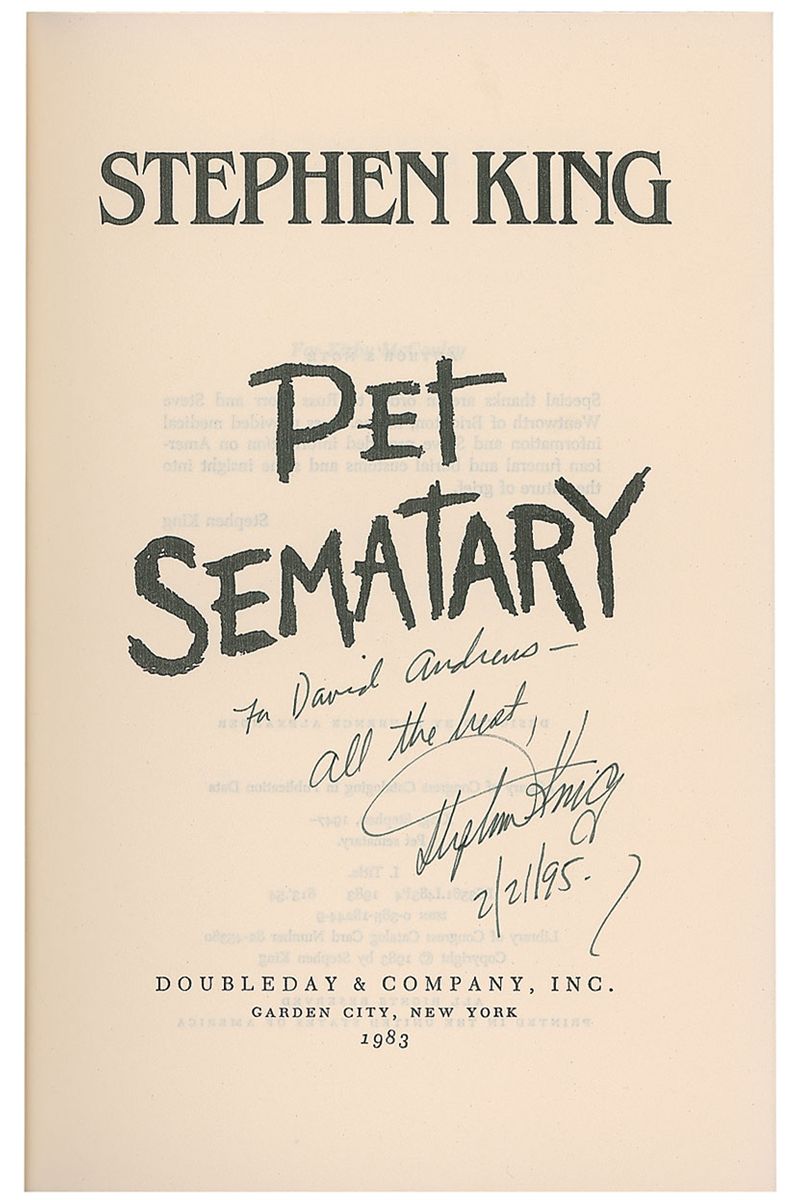 Signed book: Pet Sematary. First edition. NY: Doubleday, 1983. Hardcover with dustjacket, 6.5 x 9.5, 373 pages. Signed and inscribed on the title page, “For David Andrews—All the best, Stephen King, 2/21/95.” In fine condition, with a bit of light wear and trivial spotting to dustjacket.