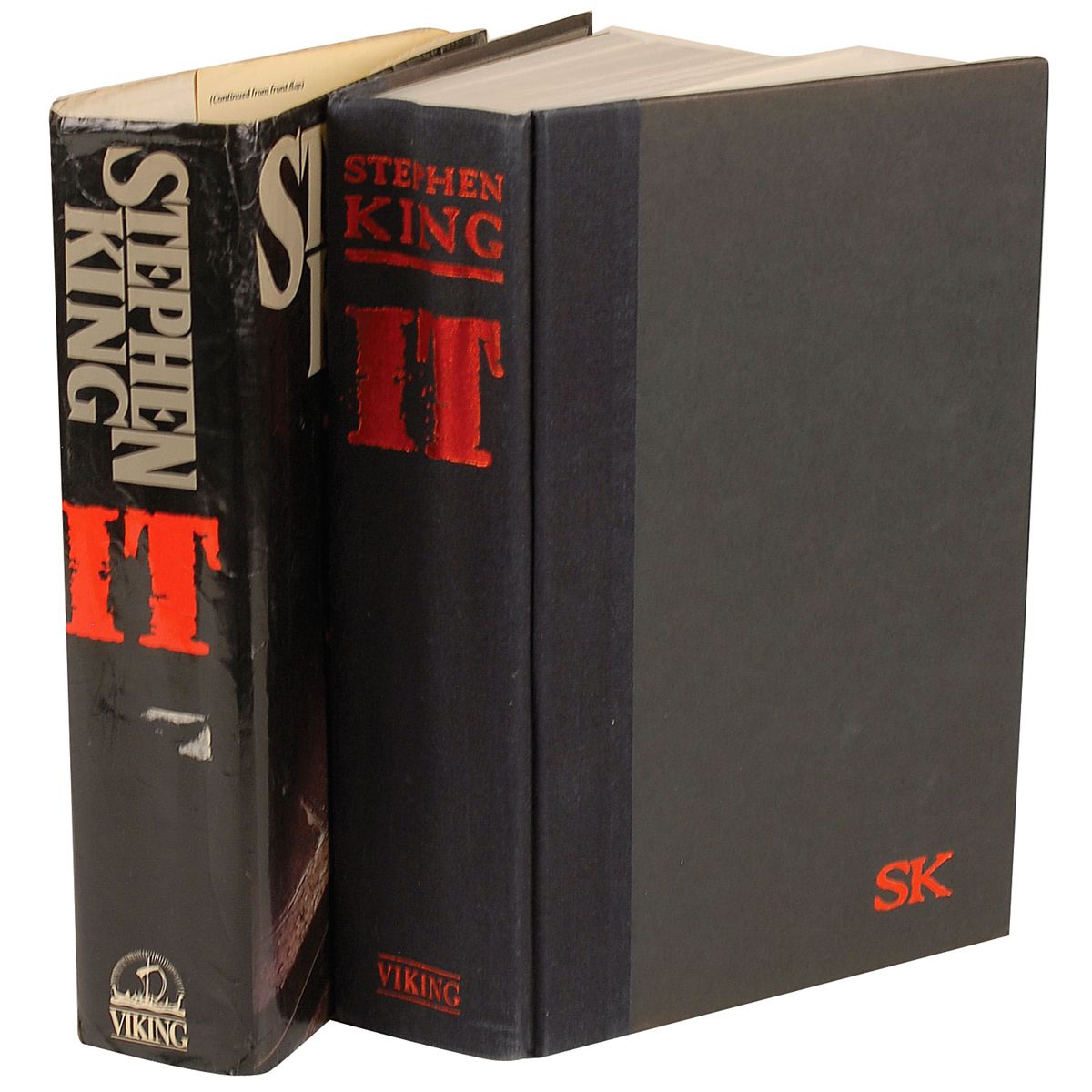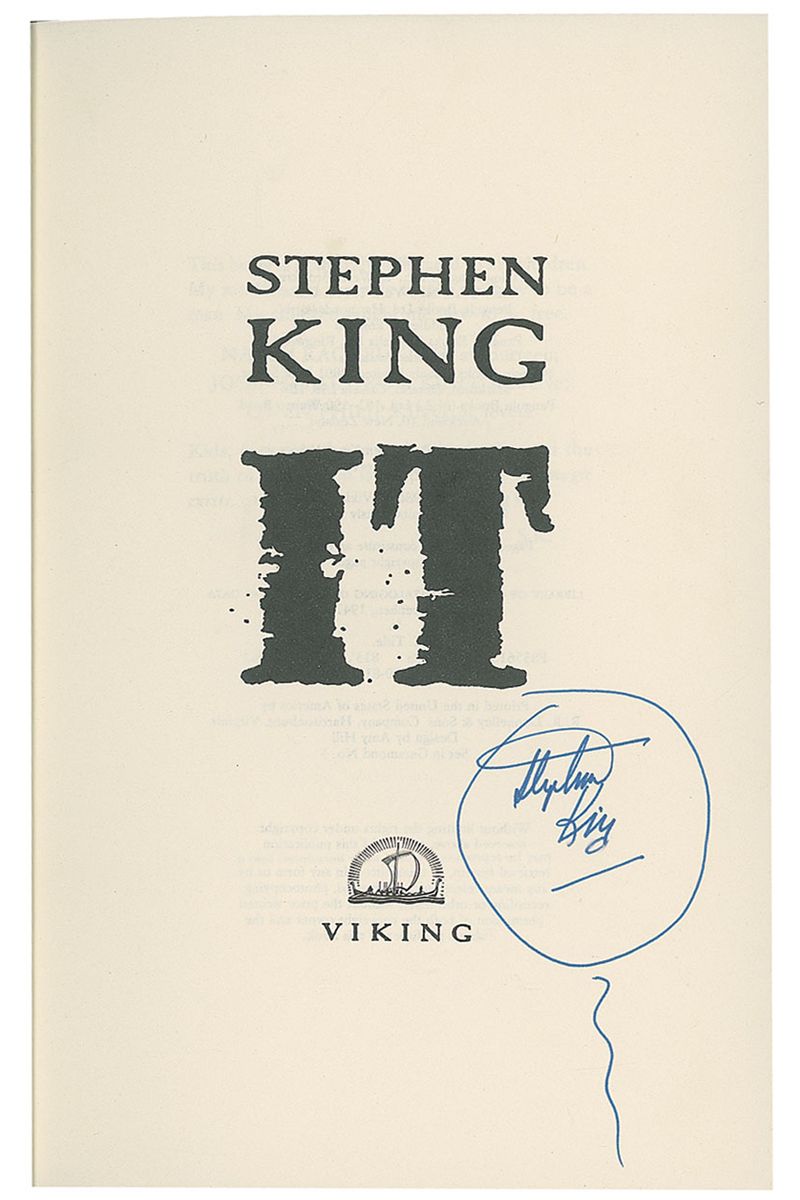 Signed book: It. First edition. NY: Viking Penguin. Hardcover with dustjacket, 6.5 x 9.5, 1138 pages. Boldly signed on the title page in blue ink “Stephen King.” Book itself is in fine condition, with moderate rippling to the spine and bumping to lower corners, resulting in a tear to bottom right of hardcover; dustjacket rates very good with overall creasing, some tears to borders, with a missing piece to upper right corner, and sticker remnant on the dustjacket spine.