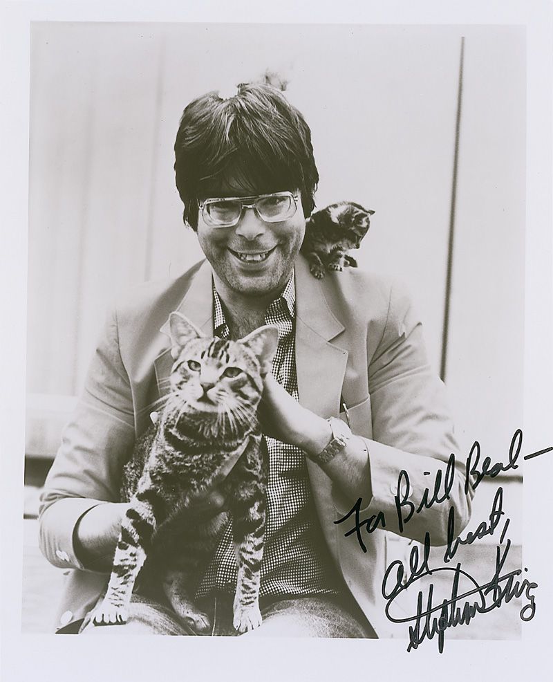Glossy 8 x 10 photo of King covered in felines, signed and inscribed in black felt tip “For Bill Beal—All best, Stephen King.” In very fine condition.