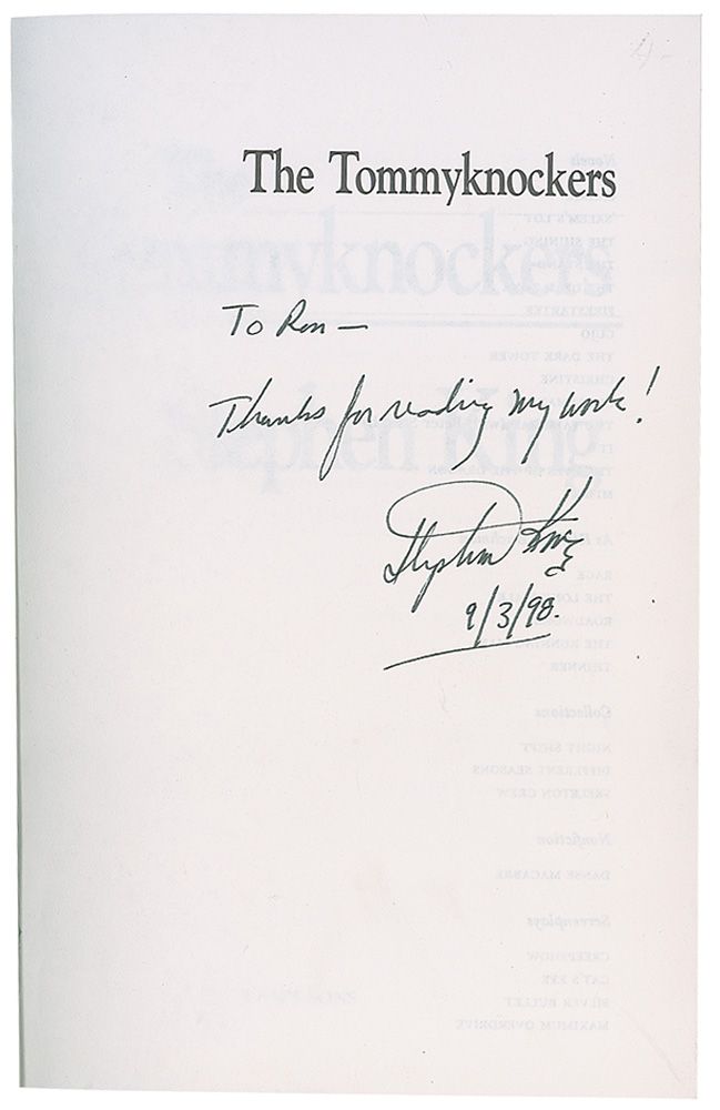 Signed book: The Tommyknockers. First edition. NY: G. P. Putnam’s Sons, 1987. Hardcover with dustjacket, 6.25 x 9.5. 558 pages. Signed and inscribed on the title page: “To Ron—Thanks for reading my work, Stephen King, 9/3/98.” In fine condition with scuffing to the dustjacket.