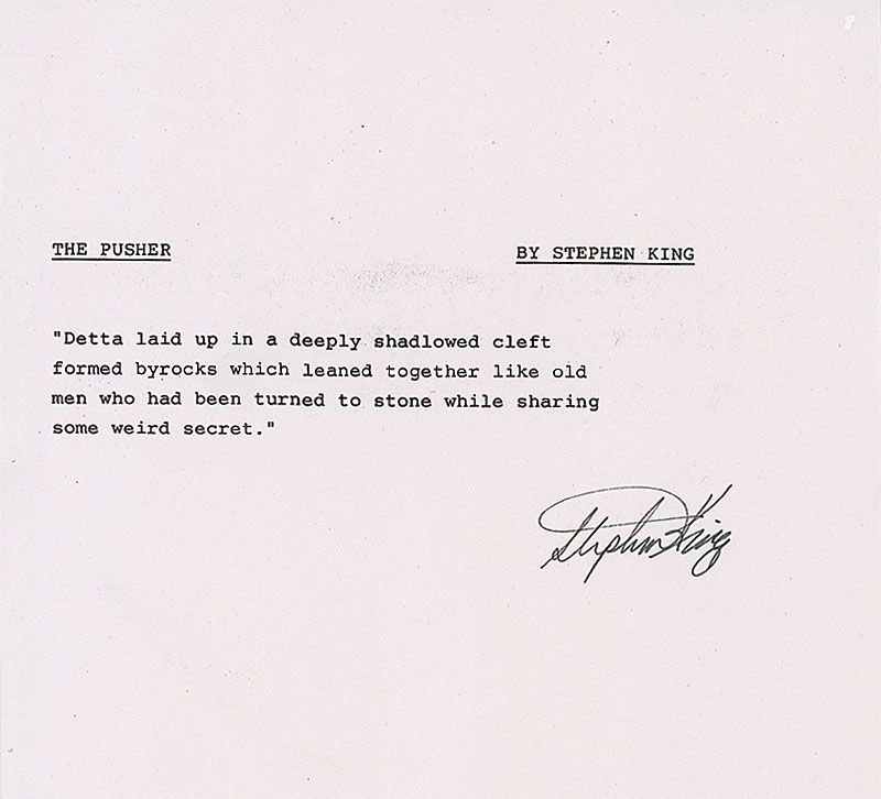 TQS on an off-white 7.5 x 6.75 sheet. A quote from The Pusher, in full: “Detta laid up in a deeply shadlowed [sic] cleft formed byrocks [sic] which leaned together like old men who had been turned to stone while sharing some weird secret.” Signed at the conclusion in black felt tip. In fine condition. Accompanied by an unsigned photo of King.