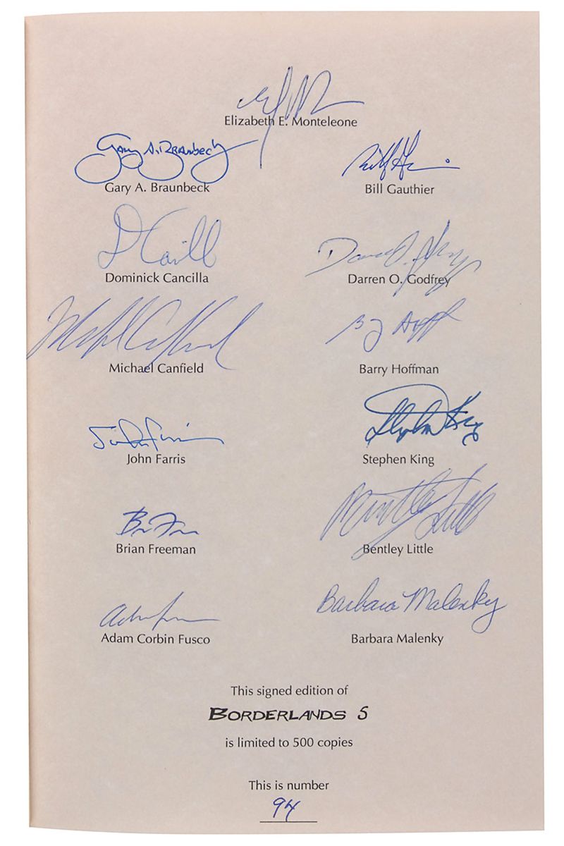 Signed book: Borderlands 5. Limited edition of 500 copies (this being No. 94). New Hampshire: Borderlands Press, 2003. Hardcover with slipcase, 6.258 x 9.5, 279 pages. Signed on the first page of the two-page colophon by King, and also signed by 26 other contributors. In very fine condition.
