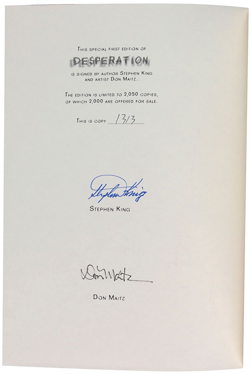 Signed book: Desperation. Limited edition of 2050 copies (this being No. 1313). New Hampshire: Donald M. Grant, 1996. Hardcover, 7.25 x 10.25, 523 pages. Signed on the colophon in blue ink by King and also signed in black ink by illusrator Don Maitz. In very fine condition. Book is housed in its original clamshell case.