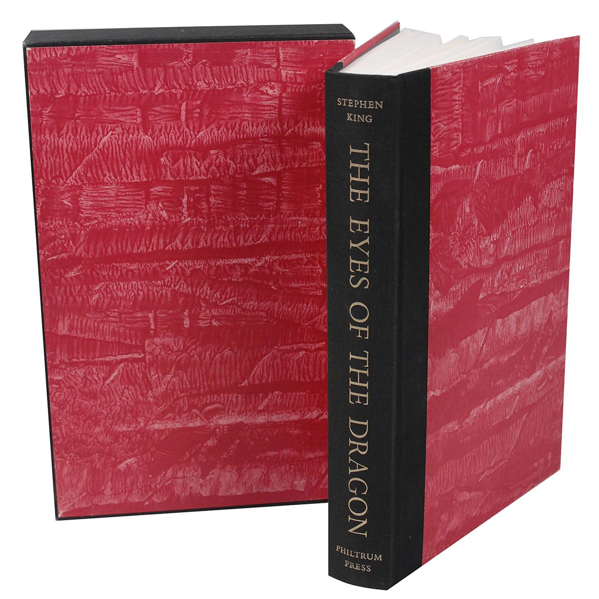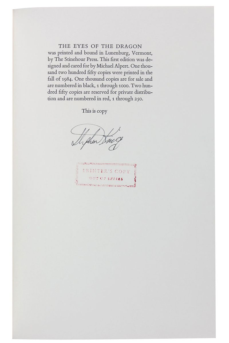 Signed book: The Eyes of the Dragon. First edition. Bangor, Maine: Philtrum Press, 1984. Hardcover with slipcase, 8.25 x 13, 314 pages. Signed on the colophon in black ink. The colophon is also stamped, “Printer's Copy, Out of Series.” The front pastedown also bears a bookplate from the Meriden Gravure Company. In fine condition.