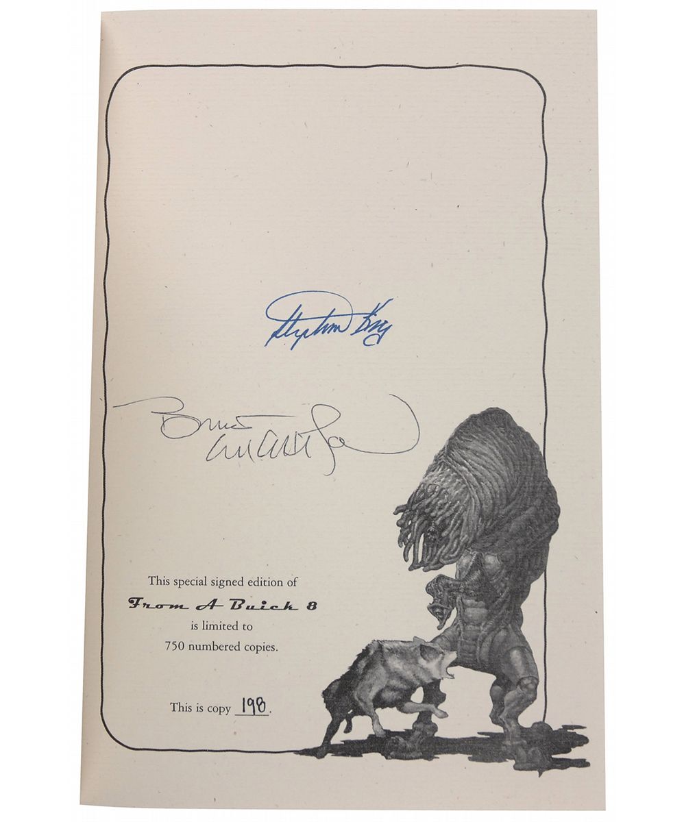 Signed book: From a Buick 8. Limited edition of 750 copies (this being No. 198). Maryland: Cemetery Dance Publications, 2002. Hardcover with dust jacket, 7.5 x 10.25, 408 pages. Signed on the colophon in blue ink by King and also signed by Bernie Wrightson. In very fine condition. Book comes in its original clamshell box.