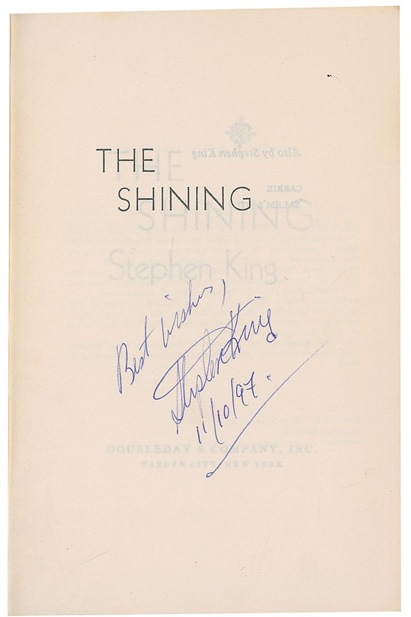 Signed book: The Shining. First edition. NY: Doubleday, 1977. Hardcover, 5.75 x 8.5, 447 pages. Signed on the half-title page, “Best wishes, Stephen King 11/10/97.” Spine and hinges a bit weak, some surface loss to front pastedown, and scattered wear to covers and spine, otherwise fine condition.