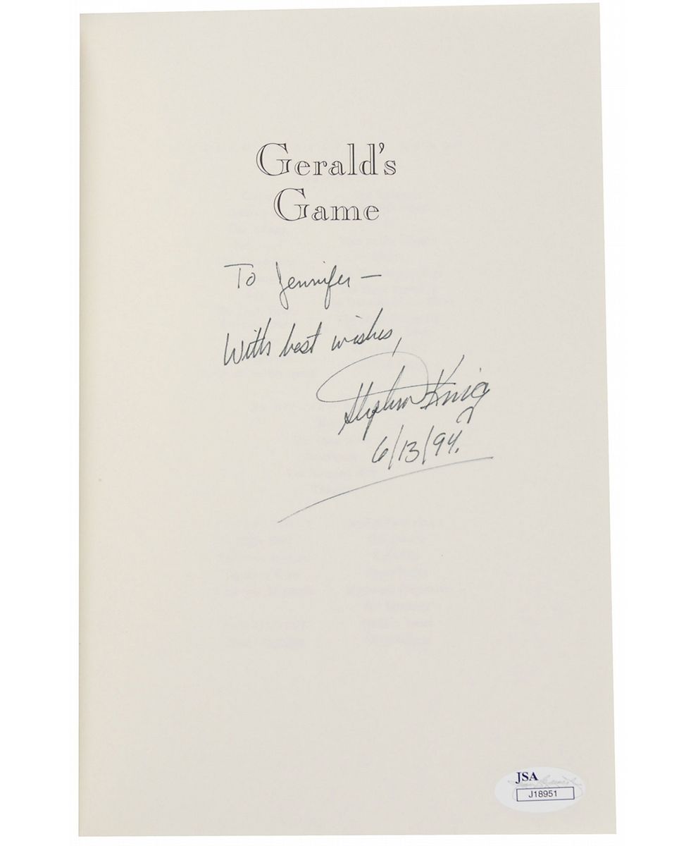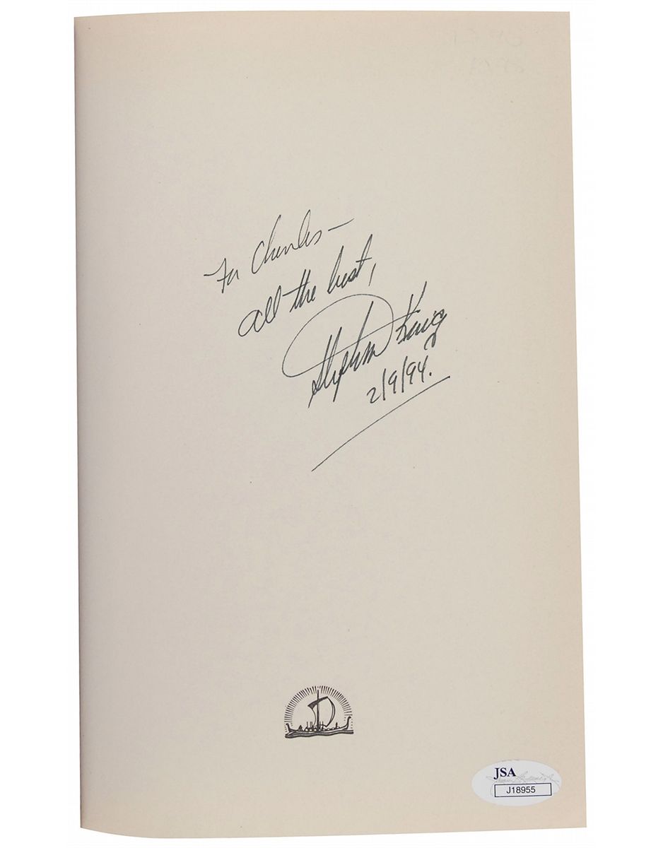 Two hardcover books: The Dark Half, signed and inscribed on the second free end page; and Gerald’s Game, signed and inscribed on the half-title page. In fine condition, with James Spence authentication labels affixed to signed pages. Accompanied by certificates of authenticity from James Spence.