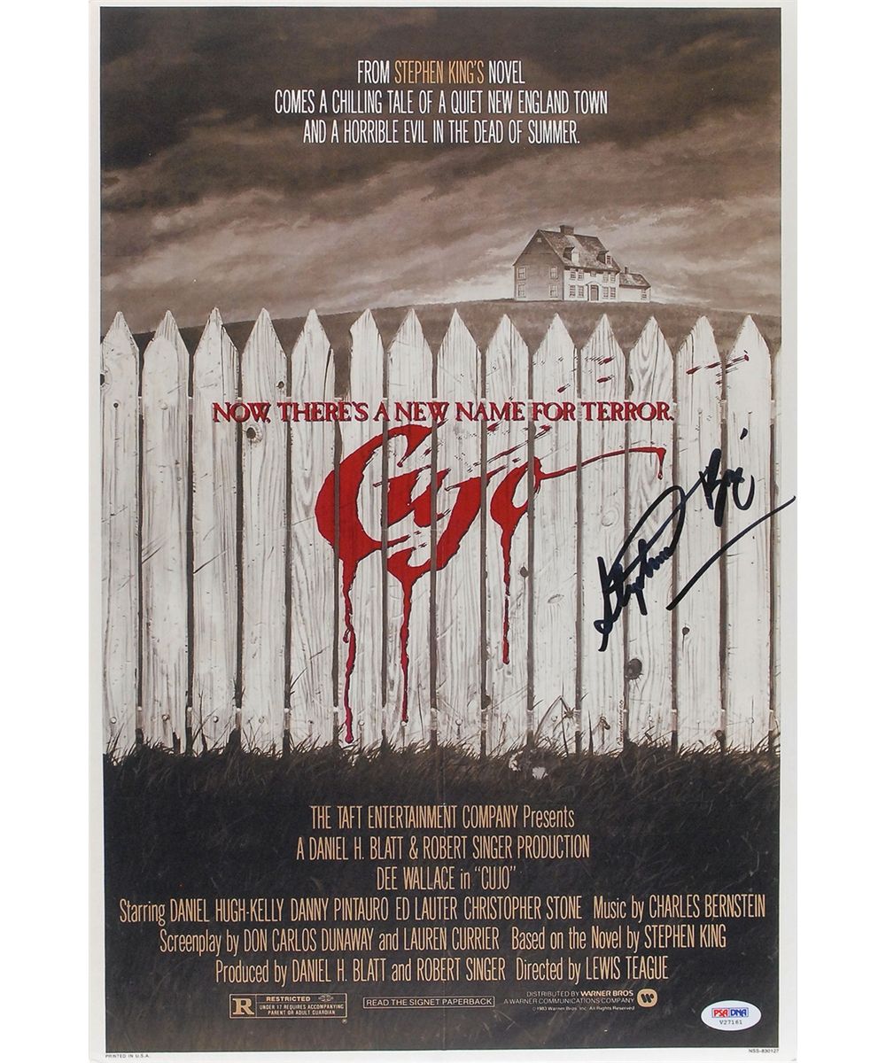Color satin-finish 12 x 18 photo of a film poster for Cujo, signed in black felt tip. In fine condition, with a PSA/DNA authentication label affixed to lower right corner. Accompanied by a certificate of authenticity from PSA/DNA.
