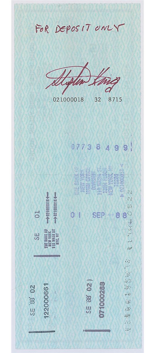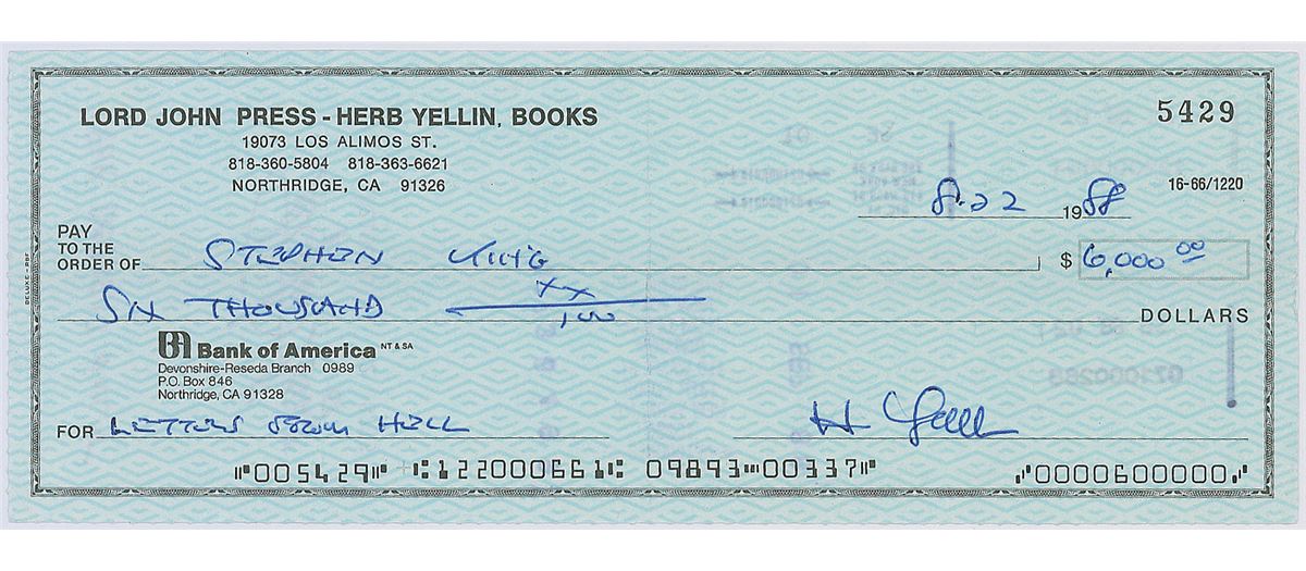 Lord John Press–Herb Yellin, Books business check, 8.25 x 3, filled out and signed by Herb Yellin, payable to Stephen King for $6,000, August 22, 1988, for “Letters from Hell,” endorsed on the reverse in red felt tip by King, “For Deposit Only, Stephen King.” In fine condition, with three vertical folds (one passing through the bottom tips of the signature) and expected bank stamps. King partnered with Herb Yellin, publisher and founder of Lord John Press, for two limited edition publications—Dolan’s Cadillac and Letters from Hell—in 1988 and 1989.