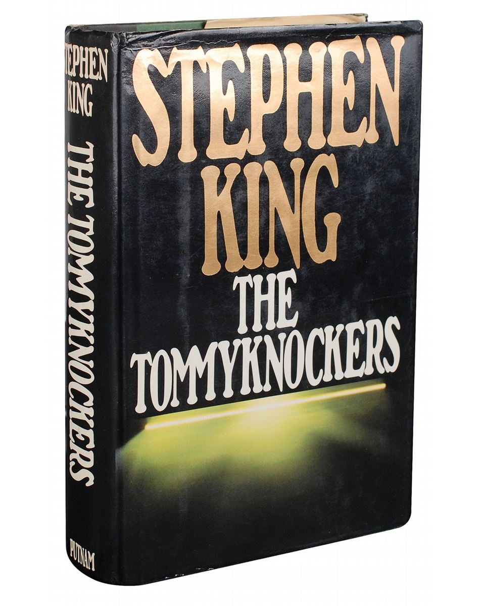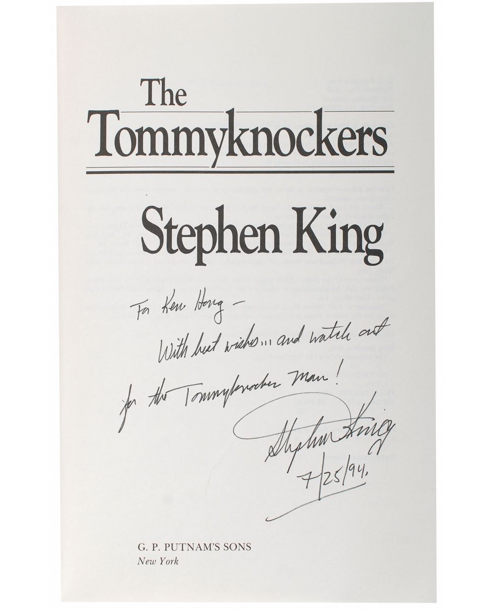 Signed book: The Tommyknockers. First edition, first printing. NY: G.P. Putnam’s Sons, 1987. Hardcover with dust jacket, 6.5 x 9.5, 558 pages. Signed and inscribed in black ink on the title page, “For Ken Hong—With best wishes…and watch out for the Tommyknocker Man! Stephen King, 7/25/94.” Some soiling and dampstaining to text block, and light rubbing and creasing to dust jacket, otherwise fine condition.