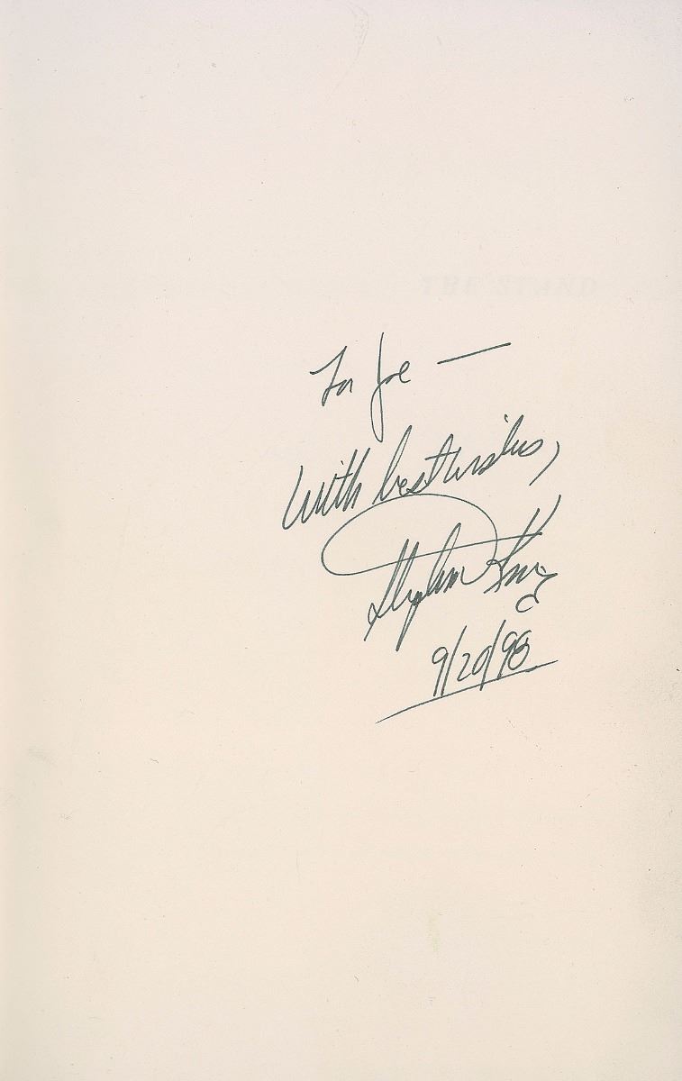 Signed book: The Stand. First edition. NY: Doubleday, 1978. Hardcover with dust jacket, 5.75 x 8.5, 823 pages. Signed and inscribed on a free end page in black ink, “For Joe—With best wishes, Stephen King, 9/20/98.” Slight wear and a small tear to dust jacket, and some trivial spots of soiling to textblock edges, otherwise fine condition.