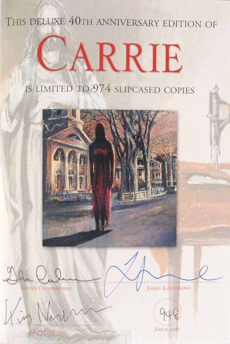 Signed book: Carrie. Deluxe 40th anniversary edition, numbered 948/974. England: PS Publishing, 2014. Hardcover with slipcase, 6.25 x 8.75, 214 pages. Signed on the half-title page in black ballpoint by King. Also signed on the colophon by Glenn Chadbourne, James Lovegrove, and Kim Newman. In fine condition.
