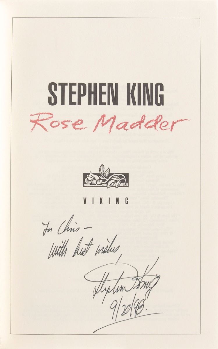 Signed book: Rose Madder. First edition, first printing. NY: Viking, 1995. Hardcover with dust jacket, 6.5 x 9.5, 420 pages. Signed and inscribed on the title page in black felt tip, “For Chris—with best wishes, Stephen King, 9/20/98.” In fine condition.