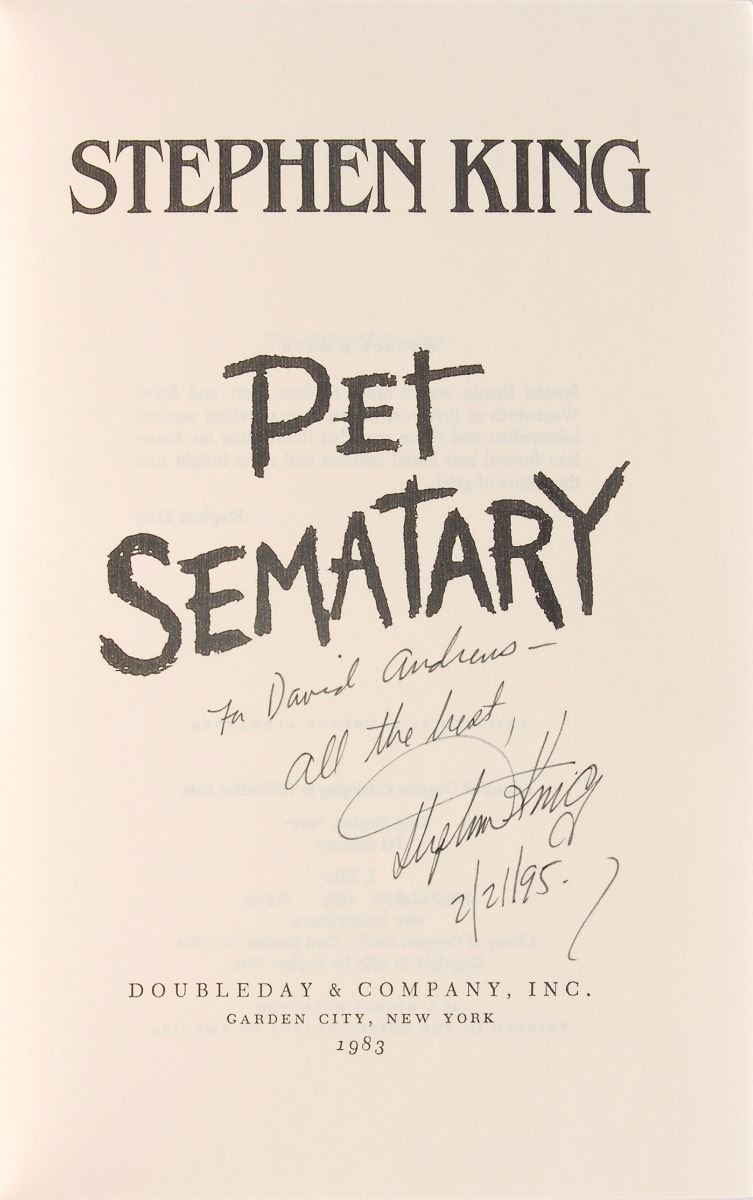 Signed book: Pet Sematary. NY: Doubleday, 1983. Hardcover with dust jacket, 6.5 x 9.5, 373 pages. Signed and inscribed on the title page in black ink, “For David Andrews—All the best, Stephen King, 2/21/95.” In fine condition.