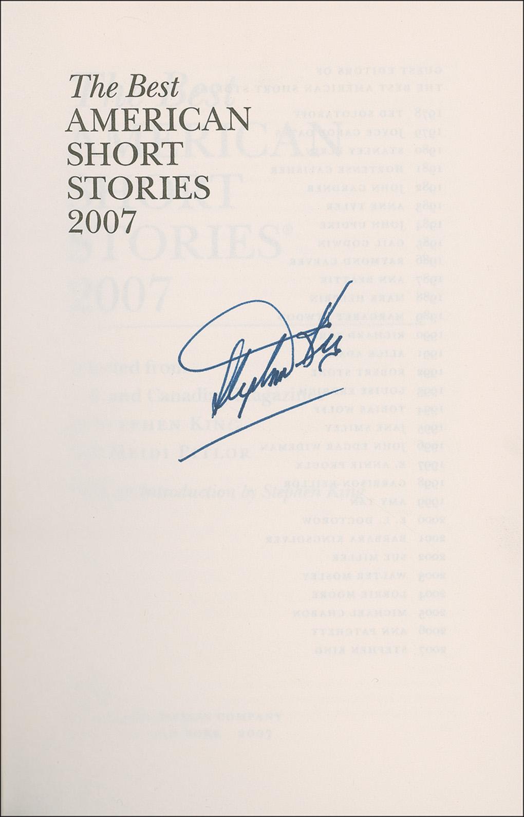 Signed book: The Best American Short Stories. First edition, first printing. Boston: Houghton Mifflin, 2007. Softcover, 5.5 x 8.25, 428 pages. Signed on the half-title page in blue ink by King. In very fine condition.