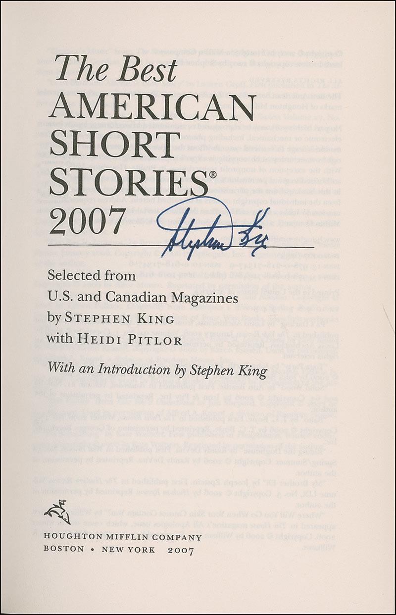 Signed book: The Best American Short Stories, edited by King. Later printing. NY: Houghton-Mifflin Company, 2007. Softcover, 5.5 x 8.25, 428 pages. Signed in blue felt tip, “Stephen King,” on the title page. In fine condition.