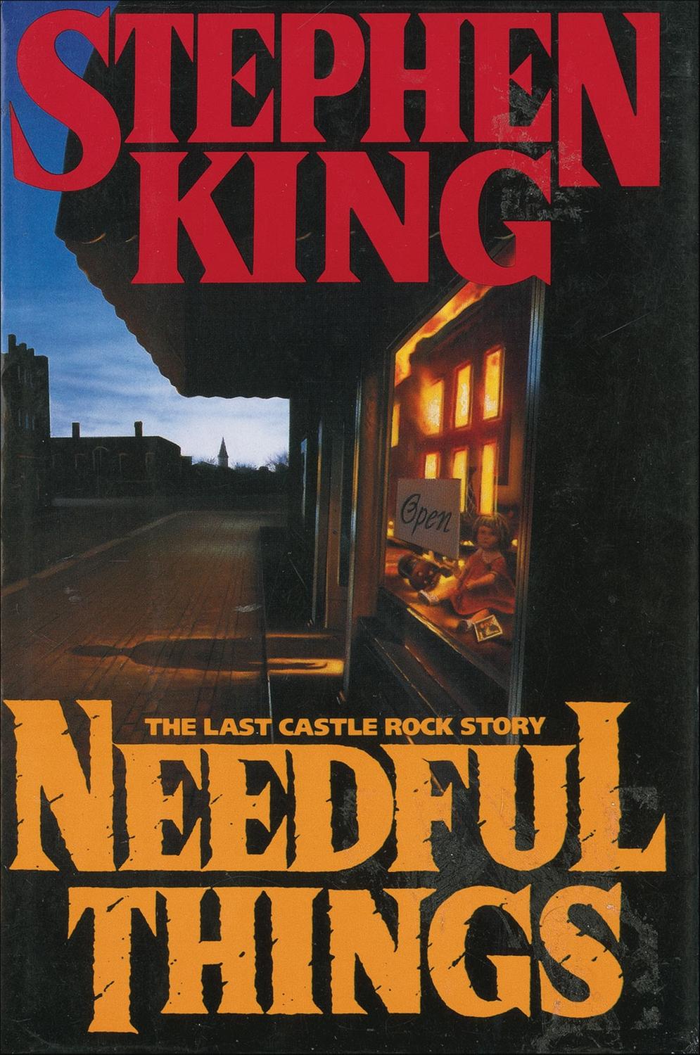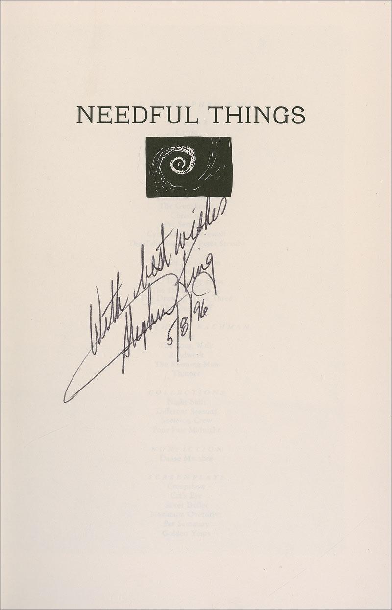 Signed book: Needful Things. Later printing. NY: Viking Press, 1991. Hardcover with dustjacket, 6.5 x 9.5, 685 pages. Signed in black ballpoint on the half-title page, “With best wishes, Stephen King 5/8/96.” Light soiling and staining the cover and some pages, the spine slightly loose, price sticker residue to the dustjacket, a small tear to the back of the dustjacket as well as a missing piece at the bottom edge, otherwise fine condition.