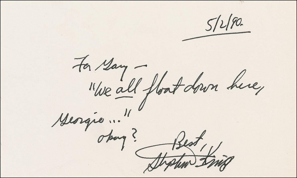 Rare AQS from Pennywise the Clown from King’s novel It, on an off-white 5 x 3 card. King writes in full: “For Gary—’We all float down here, Georgie …’ okay? Best, Stephen King 5/2/90.” In very fine condition. The first such direct handwritten King quote we have seen