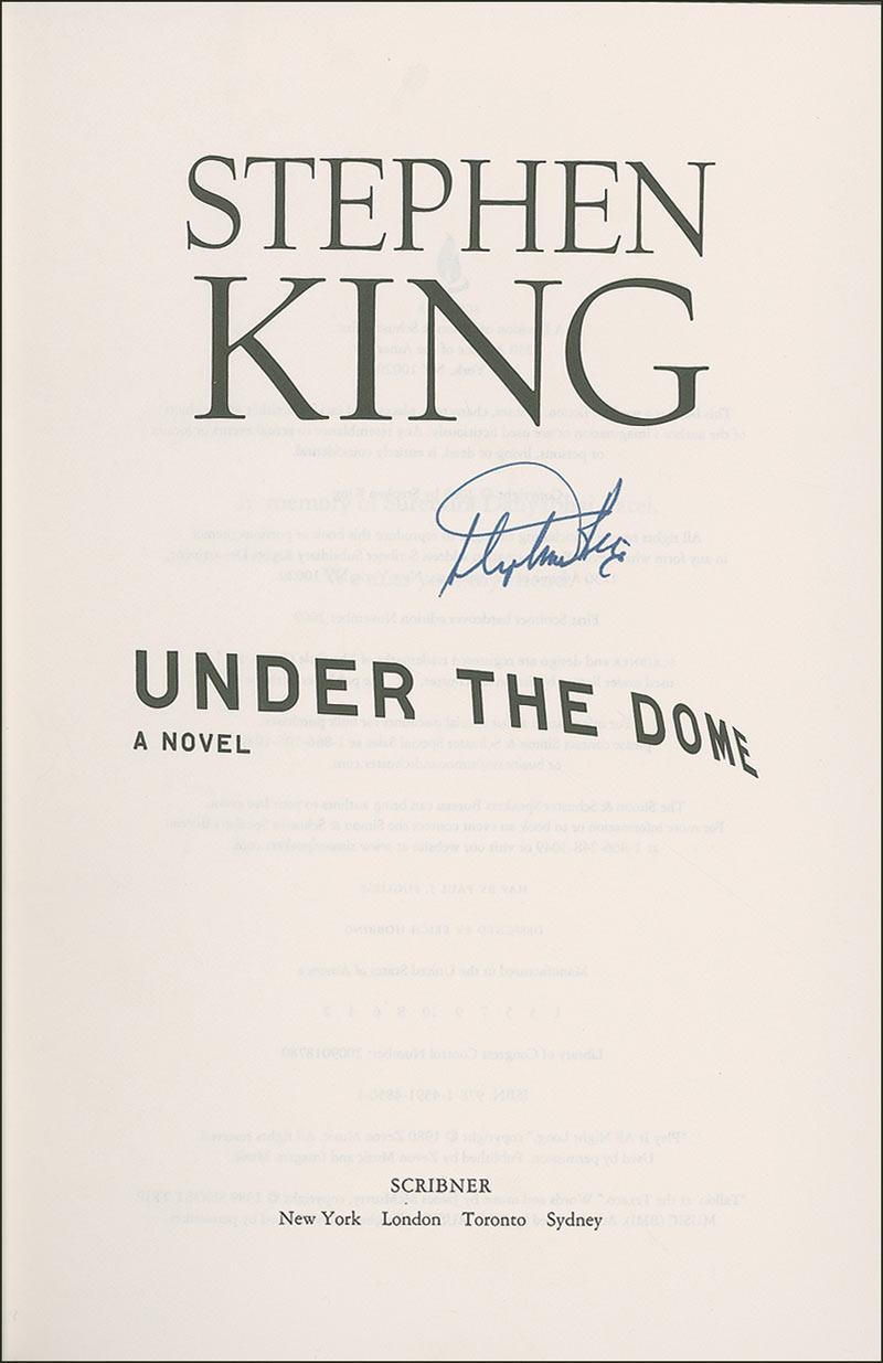 Signed book: Under the Dome. First edition, first printing. NY: Scribner, 2009. Hardcover with dustjacket, 6.5 x 9.5, 1074 pages. Signed on the title page in blue felt tip. In very fine condition.