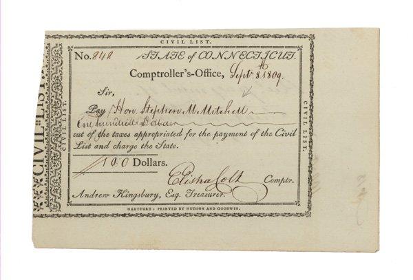 STEPHEN MIX MITCHELL (1743-1835) Jurist and statesman. Partially Printed Document Signed on Verso, “Recd payment of Treasurer Kingsbury, Stephen M. Mitchell.” One page, 8” x 5 1/4”. State of Connecticut Comptroller’s-Office. September 8, 1809. The Partially Printed Pay Order pays Mitchell “ … One hundred dollars out of the taxes appropriated for the payment of the Civil List … ” Mitchell represented Connecticut in the Continental Congress and in the U.S. Senate. In addition, he served as Chief Justice of Connecticut’s Supreme Court. Extremely Fine.