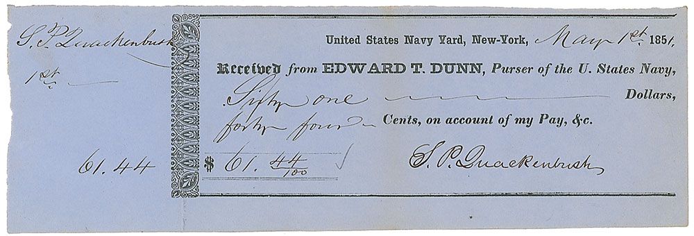 Union naval officer who commanded the USS Delaware. Partly-printed DS, signed “S. P. Quackenbush,” one page, 8 x 2.75, May 1, 1851. US Navy document confirming receipt of a $61.44 payment. In fine condition, with a vertical fold to the left side. Accompanied by an unsigned original carte-de-visite portrait.