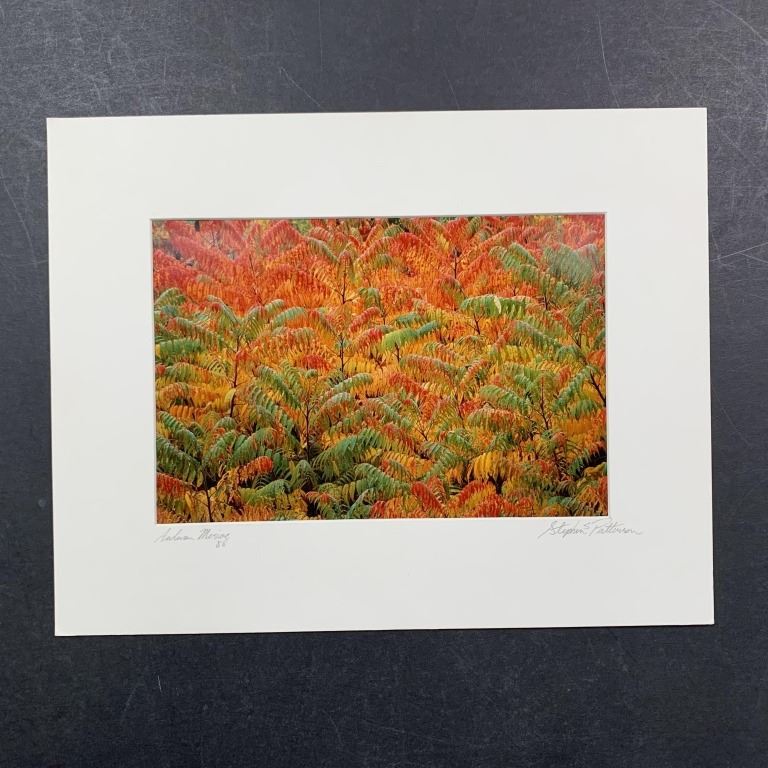 Stephen S. Patterson's "Autumn Mosaic" Photographic print. This piece is a beautiful composition of the change of season from summer into fall. Vibrant red, orange and green are showcased as the leaves change color. This piece is matted with signature and title on the matting under the cutout.