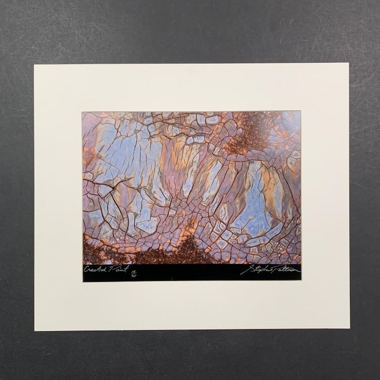 Stephen S. Patterson's "Cracked Paint" Photographic print. Sometimes, the most obscure scenery is seen as a thing of beauty. This image is an interesting composition made up of blues, greys and rusts. This piece is matted in off-white with signature, number 18/20 and title under the image.