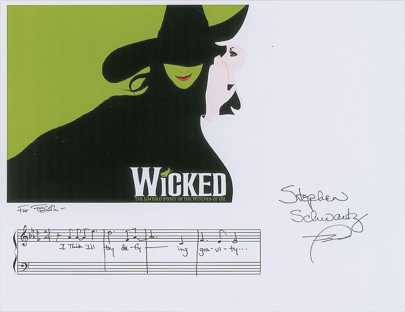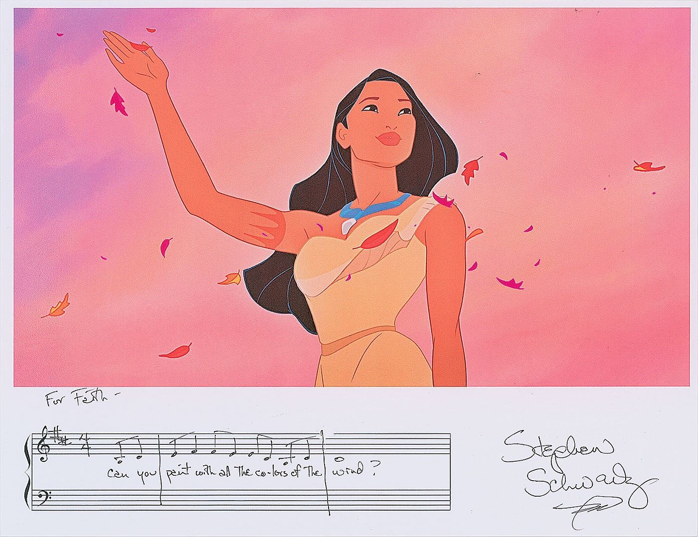 Two color 8.5 x 11 laserprint photos, one showing the titular character from the 1995 animated film Pocahontas, and the other the poster for the Broadway musical Wicked: The Untold Story of the Witches of Oz, both signed and inscribed in black ink, "For Faith—Stephen Schwartz," who adds in the lower border of each lyrics and a brief AMQS for the songs 'Defying Gravity' and 'Colors of the Wind.' In overall very fine condition.