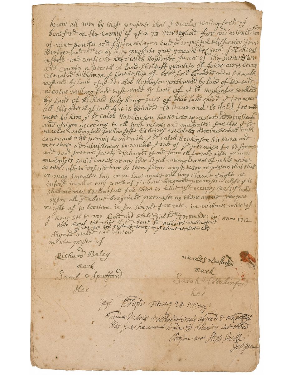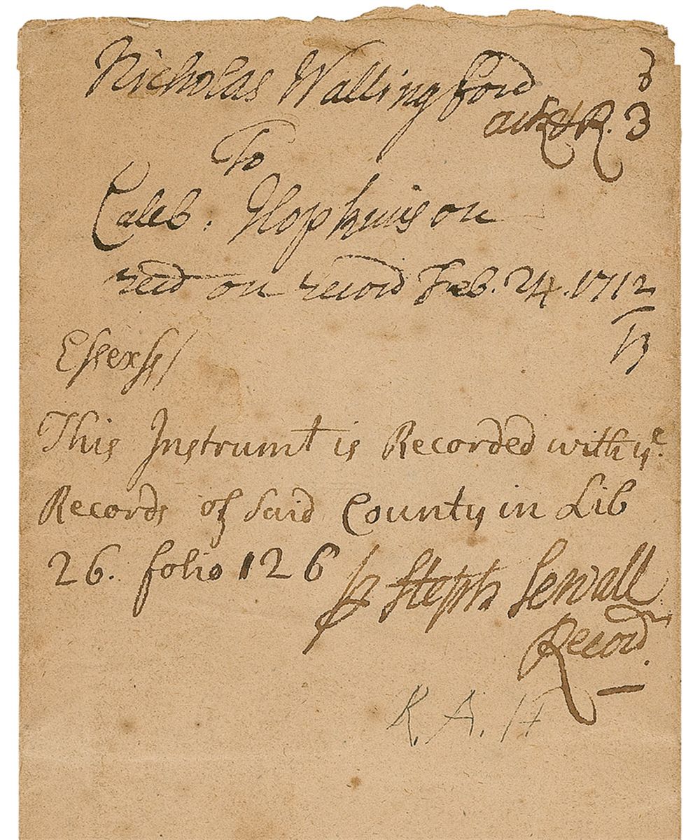 Clerk of Court at the Salem Witch Trials of 1692 and brother of Samuel Sewall, one of the presiding magistrates. Manuscript DS, signed “Steph Sewall, Just peace,” one page, 7.5 x 12, December 18, 1712. Document concerning the sale of land between Nicholas Wallingford of Bradford and Caleb Hopkinson, Jr. Signed at the conclusion by Sewall as justice of the peace, writing “Nicholas Wallingford personally appeared,” and signed again on a docketing panel on the reverse of the second integral page as Register of Deeds for Essex County. Intersecting folds, and scattered toning, creasing, and foxing, otherwise very good condition. Any name associated with the Salem Witch Trials is highly sought after by collectors.