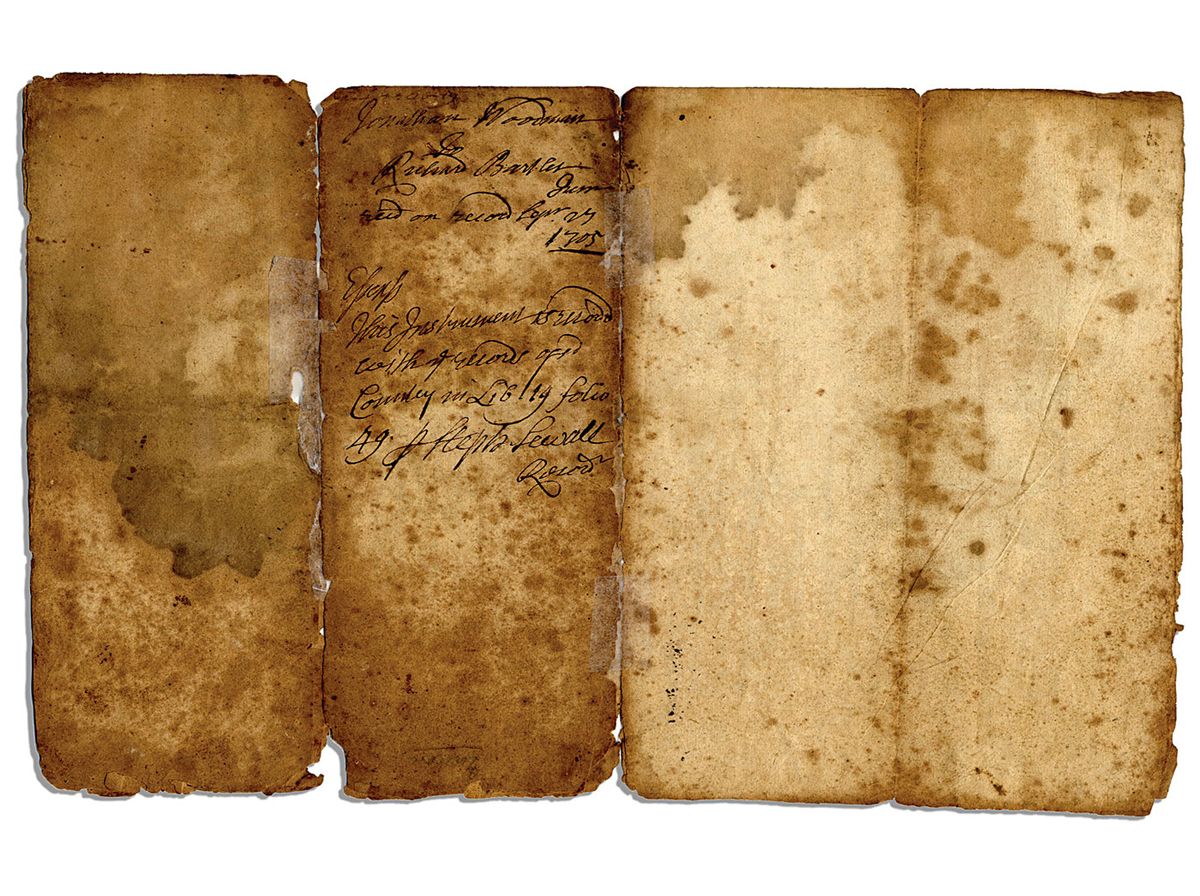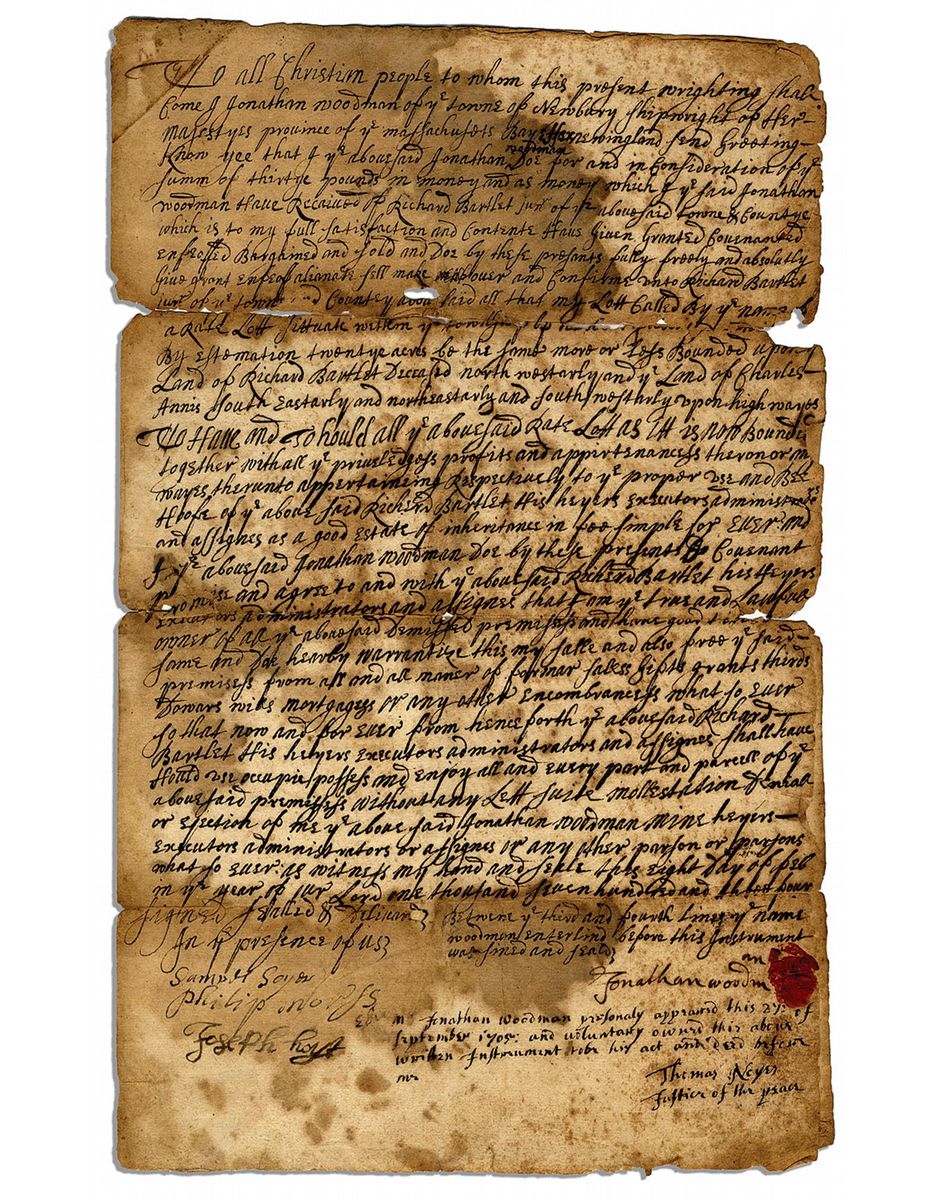 Clerk of Courts for the Salem Witch Trials. Manuscript DS in Old English, signed “Steph Sewall,” one page, 7.5 x 11.75, 1705. Boldly-penned document which names Jonathan Woodman and Richard Bartlett Jr. as parties to a land sale contract. Signed on the reverse by Sewell as recorder for Essex County, and countersigned on the front by Jonathan Woodman, Samuel Soyer, Philip Morss, Joseph Hoyt and Thomas Noyes. In good condition, with foxing and toning, moderate to heavy dampstaining, and some separations to the horizontal folds.