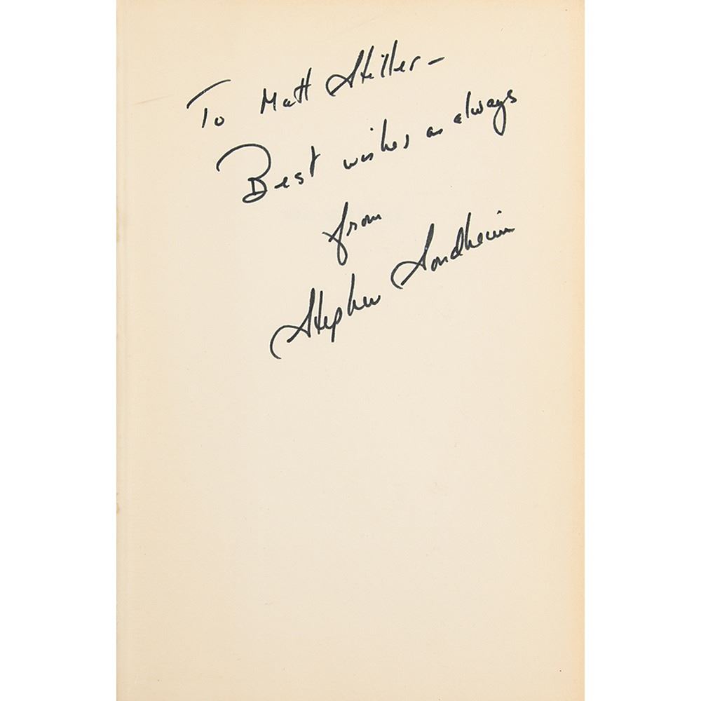 Signed book: West Side Story. First edition, first printing. NY: Random House, 1958. Hardcover with dust jacket, 5.5 x 8.25, 143 pages. Signed and inscribed on the first free end page in black felt tip by Stephen Sondheim, who wrote the lyrics for the iconic musical. Autographic condition: fine. Book condition: NF/NF, with the jacket not price clipped.
