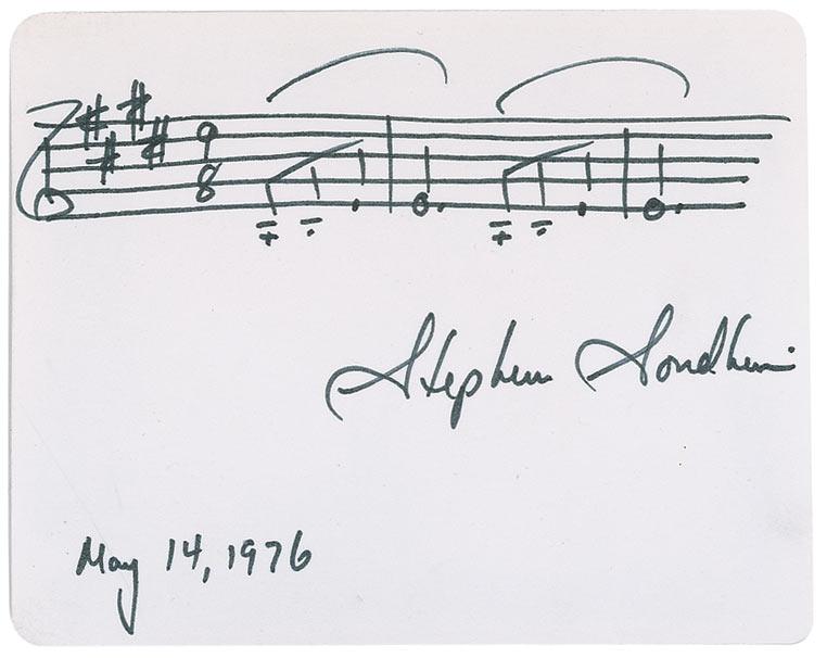 AMQS on a 4.5 x 3.5 off-white card, Sondheim pens three bars of music to ‘Send in the Clowns,’ signing “Stephen Sondheim, May 14, 1976.” In fine condition, with faint show-through from mounting residue on the reverse.