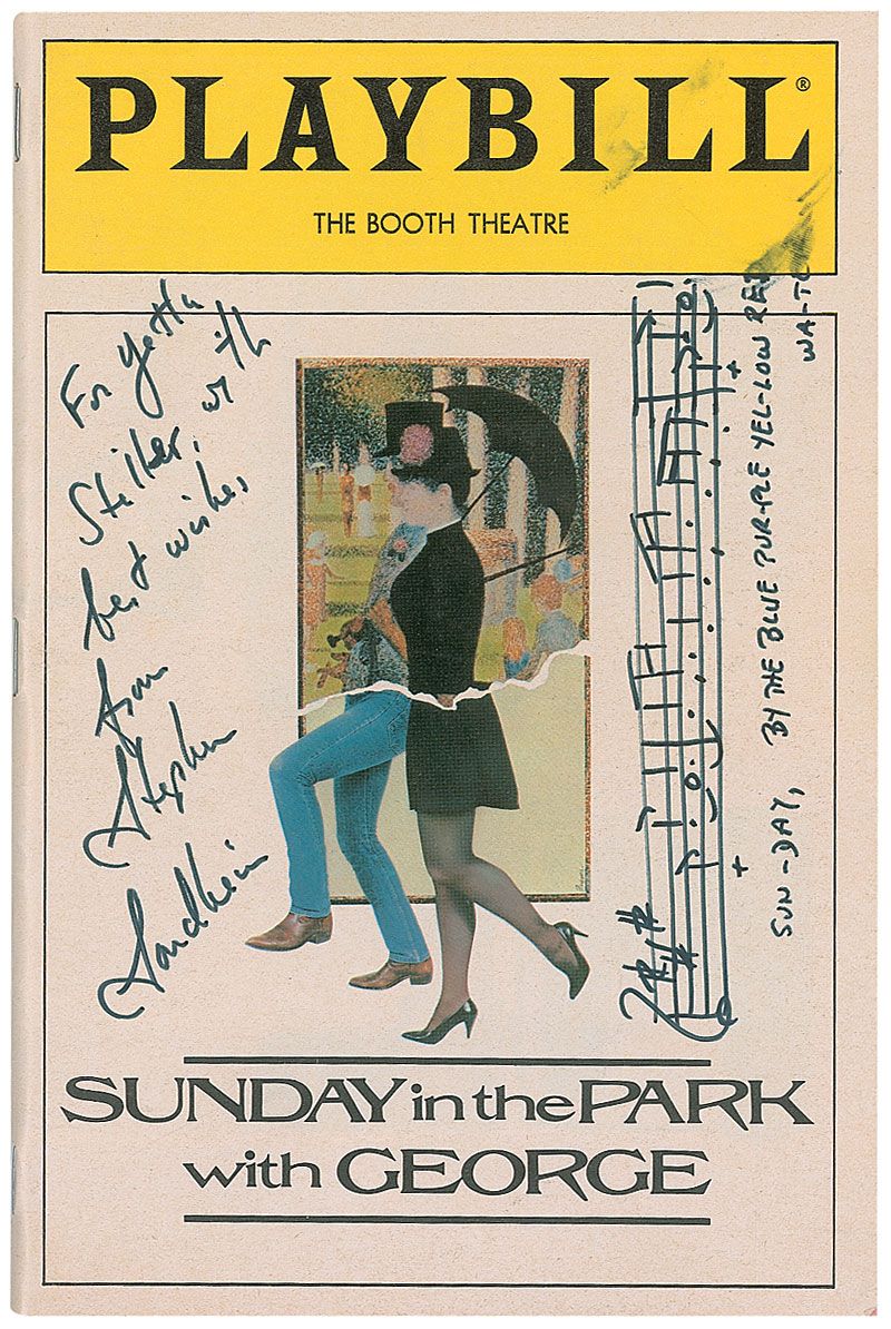 AMQS on the front cover of a Playbill from the Booth Theatre’s production of Sunday in the Park with George. Sondheim pens three bars of music and lyrics from ‘Sunday,’ signed and inscribed “For Yetta Stiller, with best wishes from Stephen Sondheim.” In f